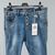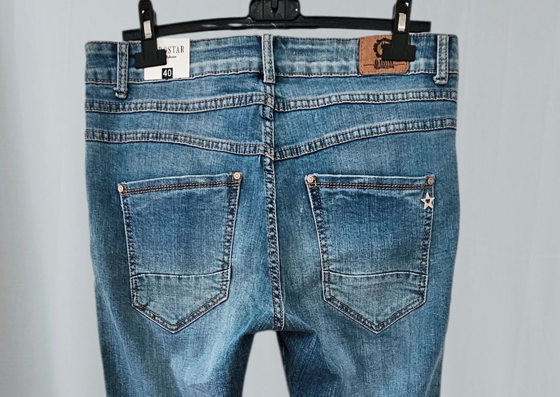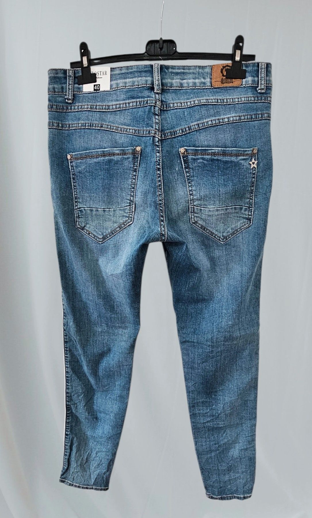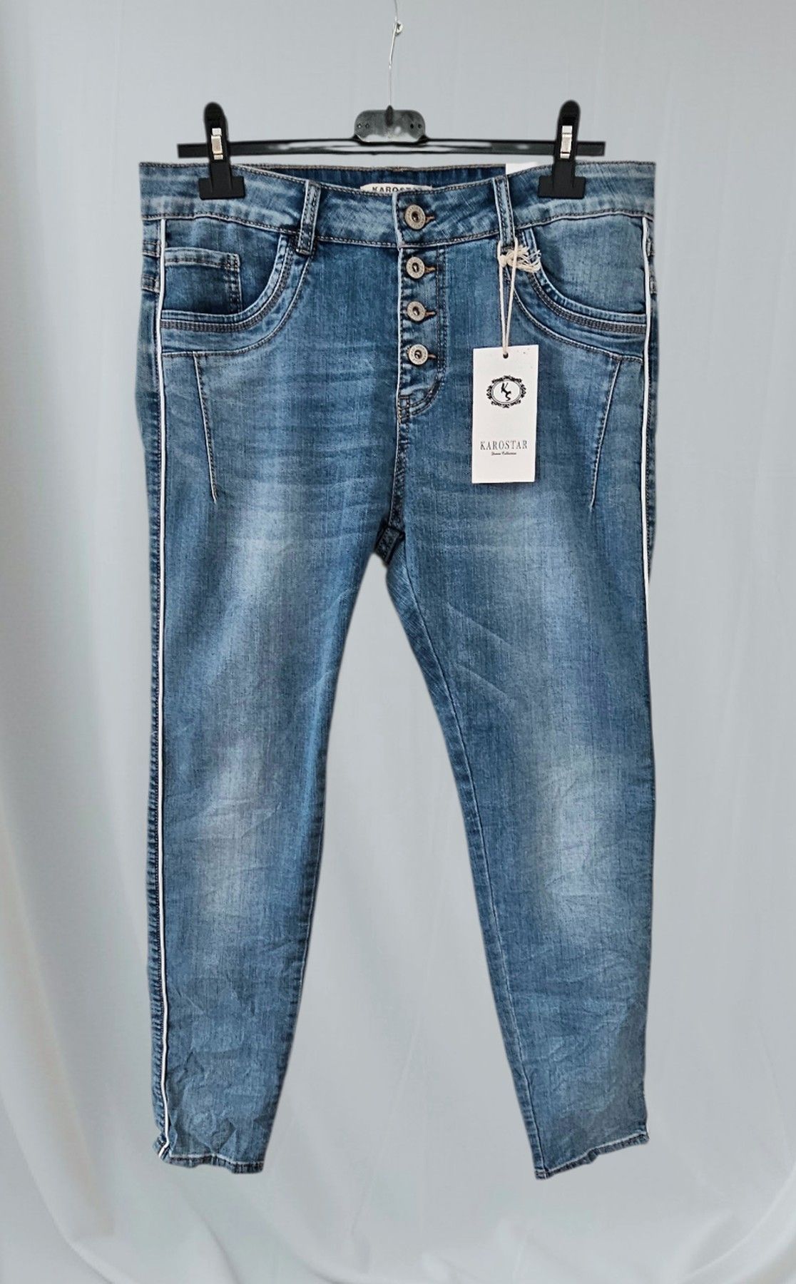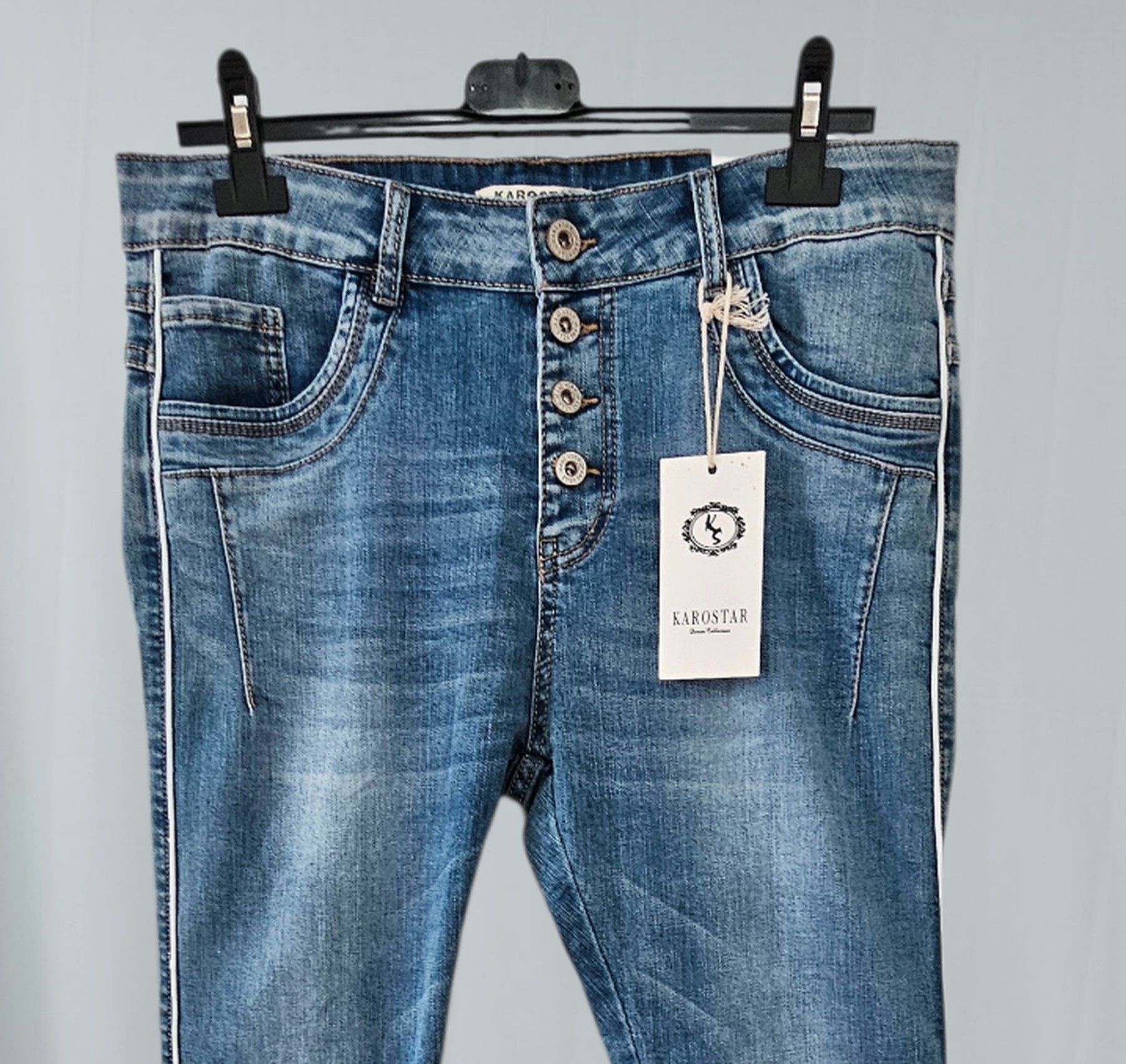 Karostar Jeans Stretch Hose Knöpfe Taschen weißer Seitenstreifen Jeansblau Gr. L/40