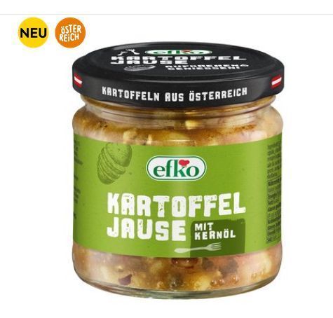 Kartoffel Jause mit Kernöl Snack von Efko 200g Gramm Glas Vegan - 3 Varianten Stückzahlen Produktdetails Ob als Snack, Jause oder erfrischender Imbiss: Der aromatische Efko Kartoffelsalat ist mit Kernöl hergestellt. hergestellt in Österreich Zutaten Zutaten: 61% Kartoffeln, Wasser, 3,3% Steirisches