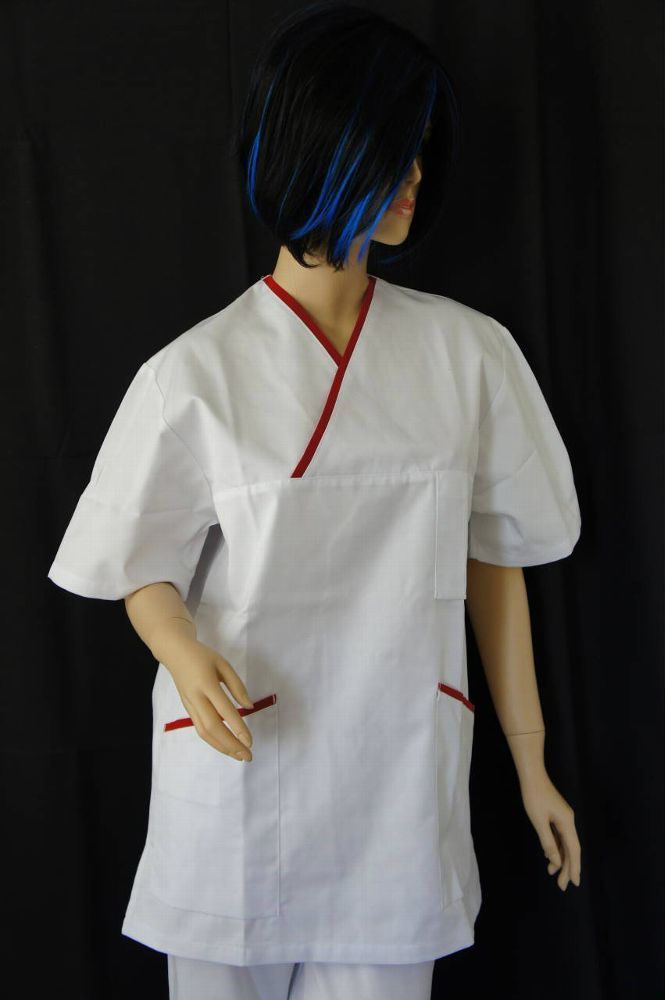 Unisex-Schlupfkasack, Art. Angelika Überlappender V-Ausschnitt, Kurzarm, 1 Brusttasche, 2 Seitentasche, Seitenschlitze (durch UNISEX fällt dieser Kasack eher groß aus) Gewebe: 65% Polyester/35% Baumwolle Farbe: weiss mit schmalen roten Besätzen an V-Ausschnitt und Seitentaschen ACHTUNG: Größentabelle beachten!