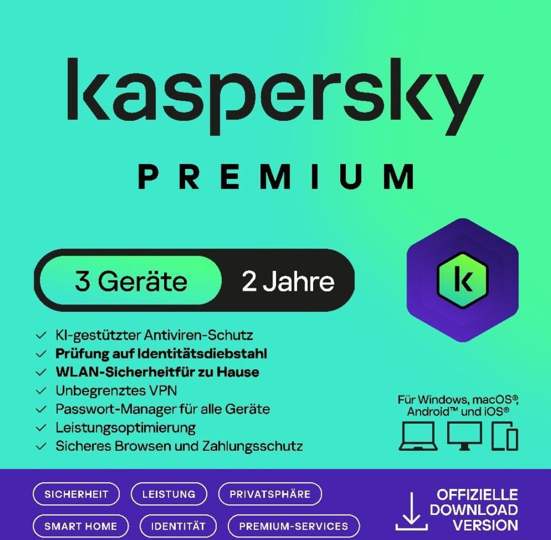 Kaspersky Kaspersky Premium & VPN 2026 - 3 PC / 2 Jahre - Windows/Mac/Android/iOS - Per Mail