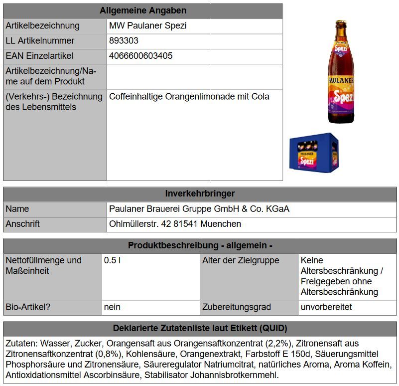 Kasten Tragl Paulaner Spezi 20 x 0,5l Cola-Mix Glasflasche Mehrweg-Pfand