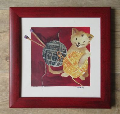 Bild mit Rahmen Katze mit Wollknäuel 31 x 31 Druck Gemälde Wandbild Kunstdruck