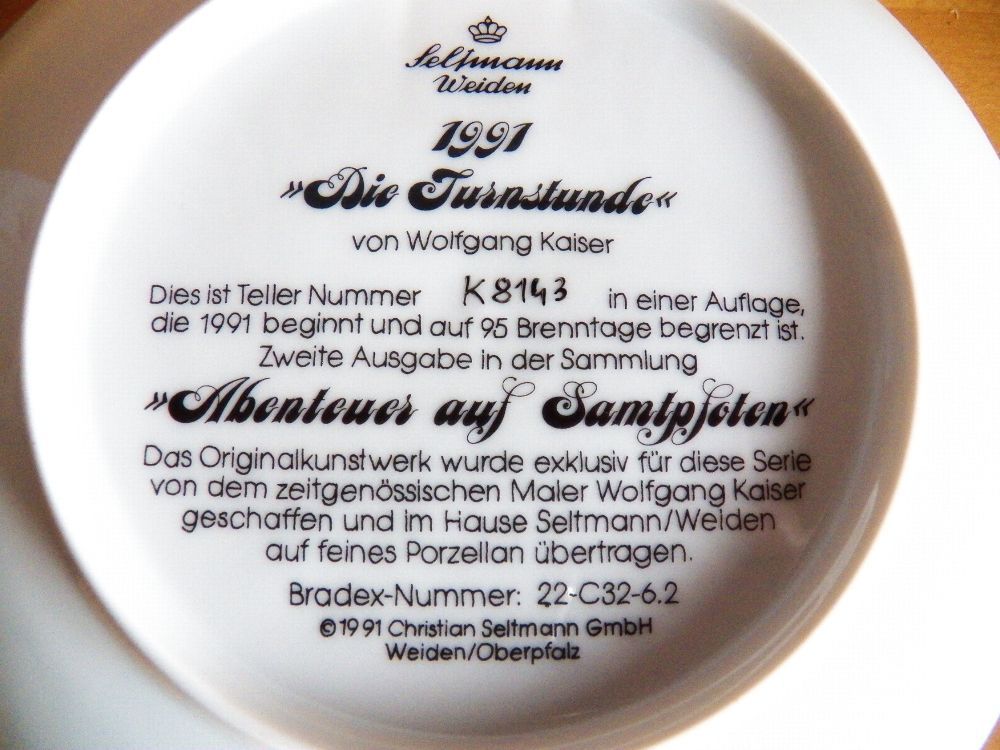 Mit Zertifikat - Teil könnte vom lagern verstaubt oder verschmutzt sein von Wolfgang Kaiser Dies ist Teller Nummer K8143 in einer Auflage,die 1991 beginnt und auf 95 Brenntage begrenzt ist. Zweite Ausgabe in der Sammlung ABENTEUER AUF SAMTPFOTEN Das Originalkunstwerk wurde exklusiv für diese Serie v