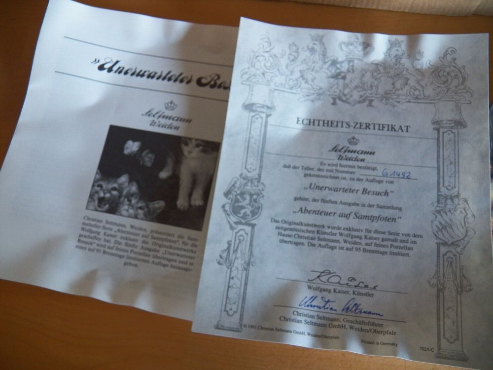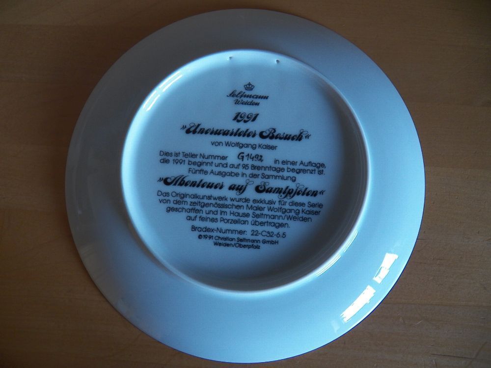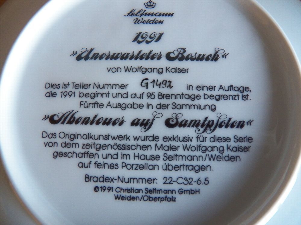 Mit Zertifikat - Teil könnte vom lagern verstaubt oder verschmutzt sein von Wolfgang Kaiser Dies ist Teller Nummer G1492 in einer Auflage,die 1991 beginnt und auf 95 Brenntage begrenzt ist. Fünfte Ausgabe in der Sammlung ABENTEUER AUF SAMTPFOTEN Das Originalkunstwerk wurde exklusiv für diese Serie v