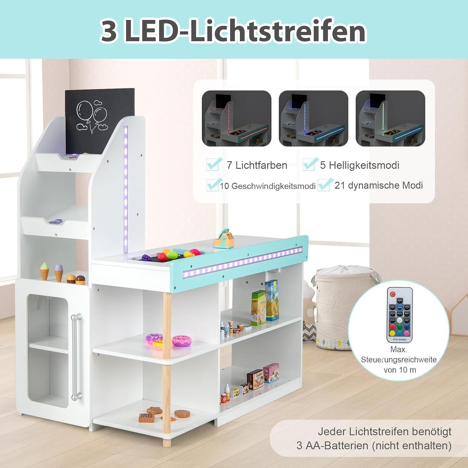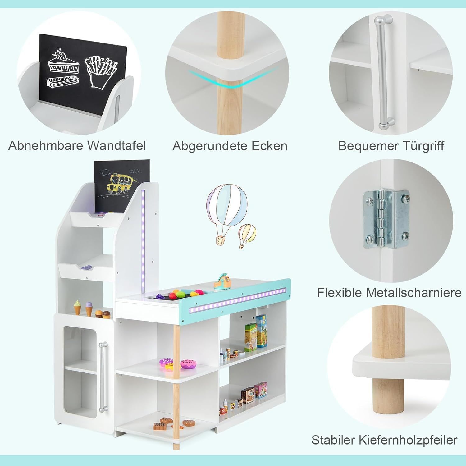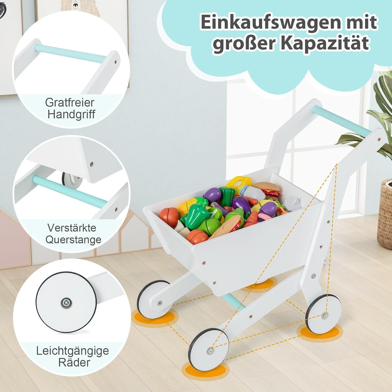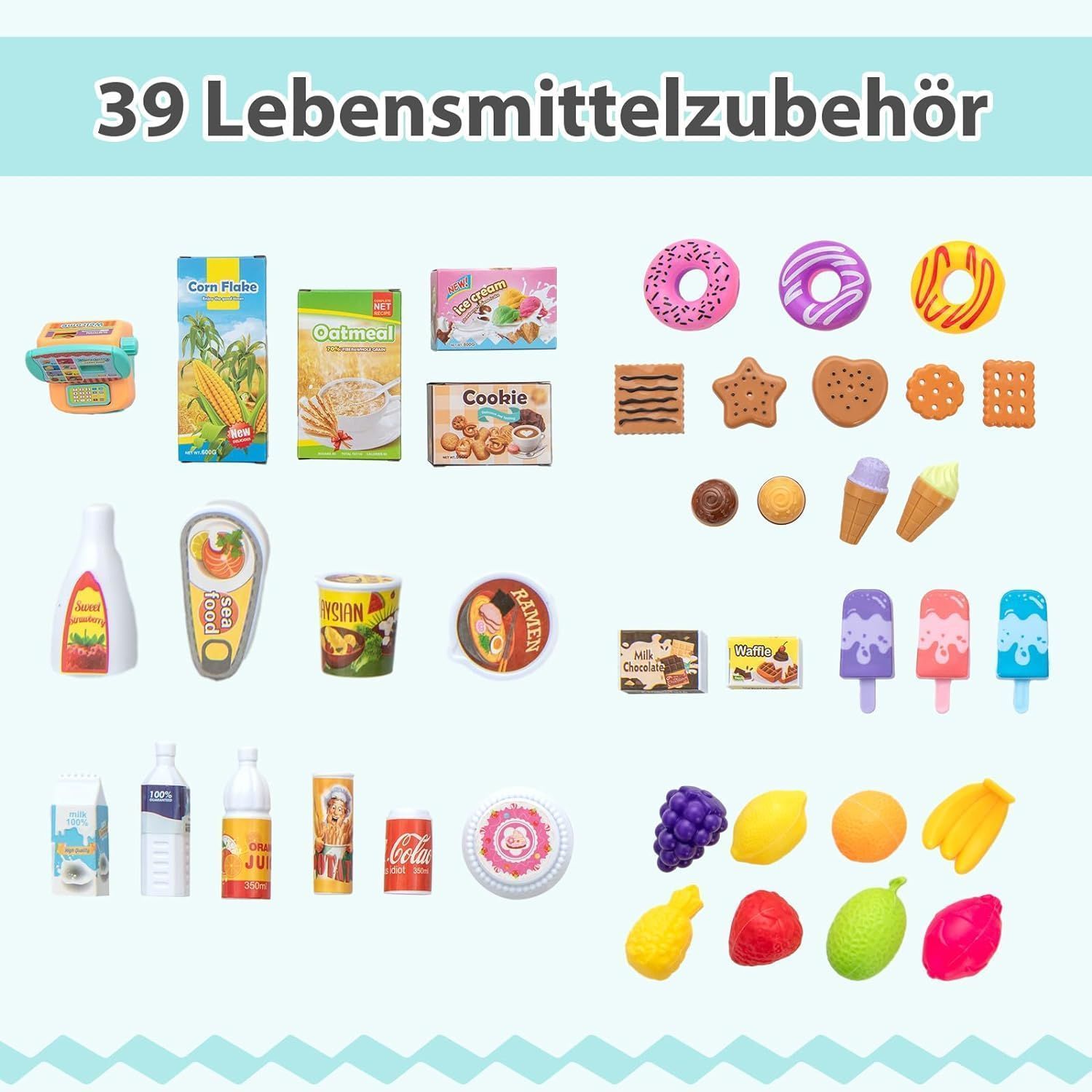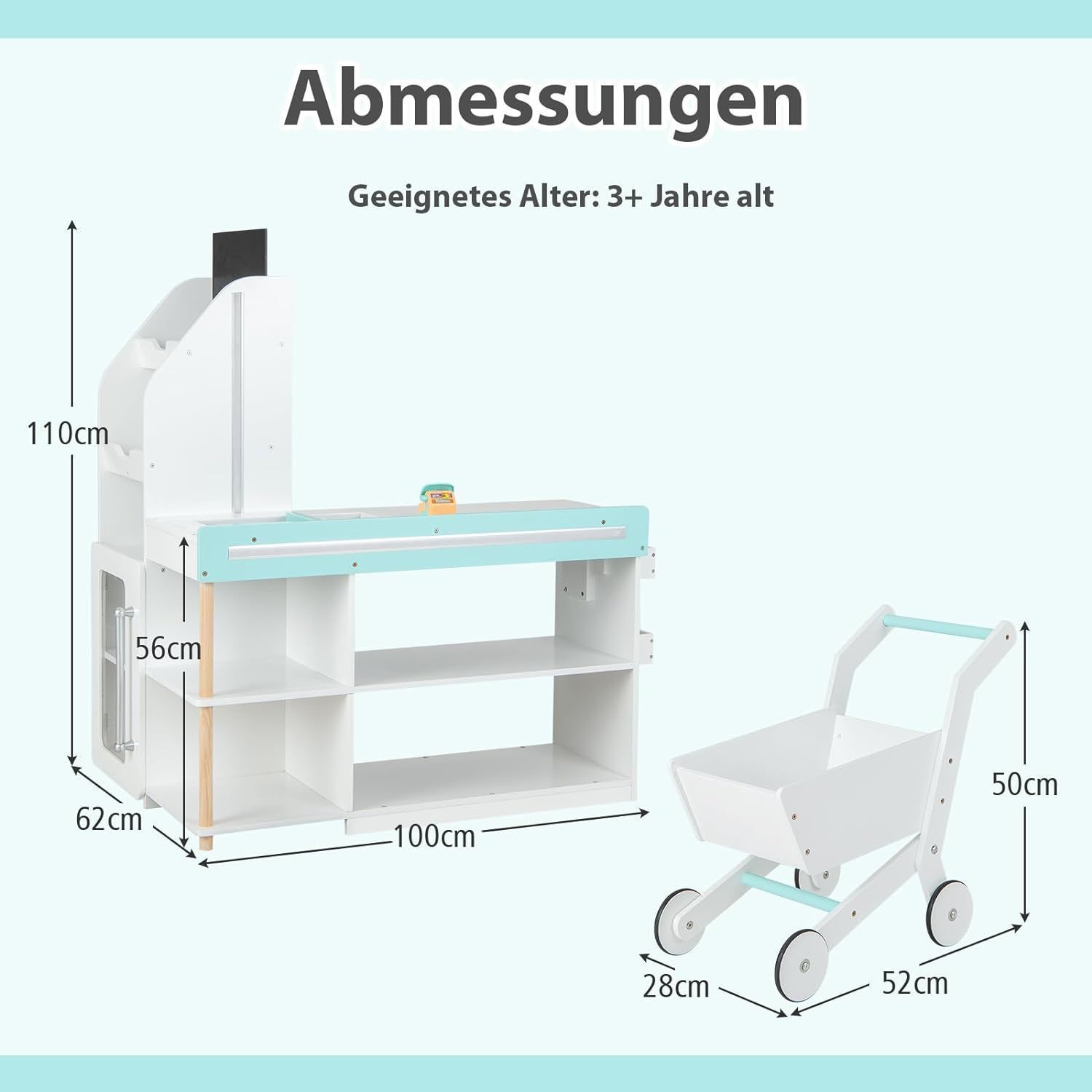 Kaufladen Kinder mit Einkaufswagen, Einkaufsladen Holz mit Kasse & 39 Zubehör & Tafel