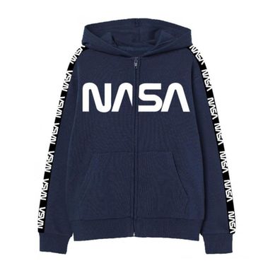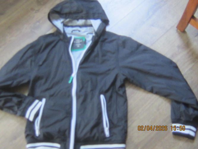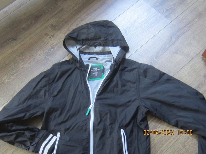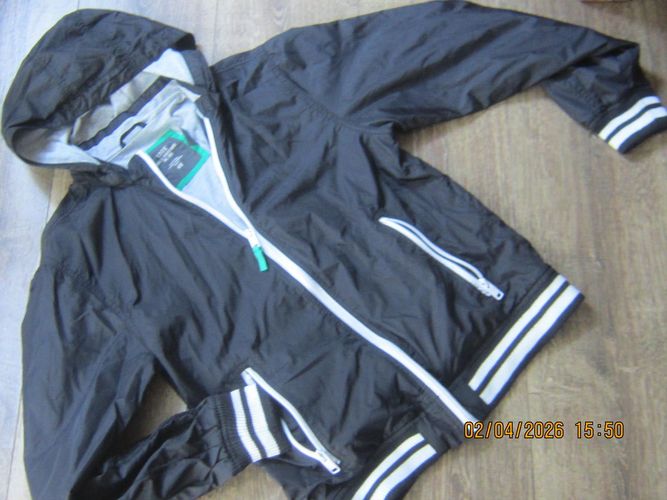 Die Jacke ist mit Reißverschluss und Kapuze eine leicht gefütterte Jacke . Die Jacke hat gestreifte Bündchen an den Armen und am Saum .
