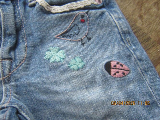 Die Jeans ist hellblau mit kleiner Stickerei an der Tasche . Der Bund ist zum verstellen .