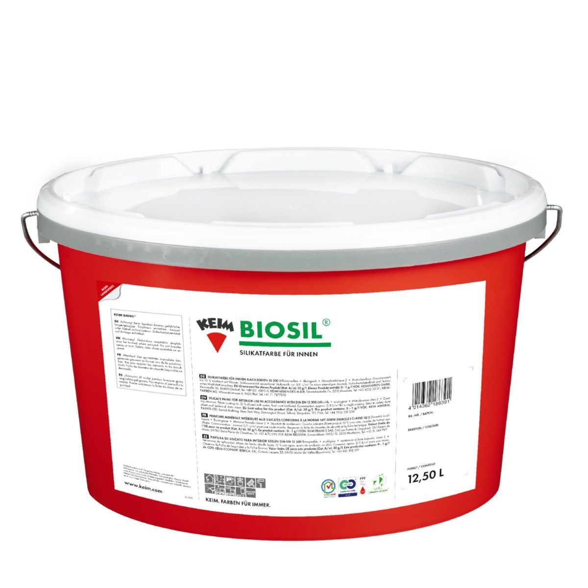 KEIM Biosil® 12,5 Liter Details für Biosil® 12,5 Liter: Anwendungsfertige Silikatfarbe für Innen nach DIN EN 13300. Erfüllt auch die DIN 18363 Abs. 2.4.1, Dispersionssilikatfarbe. Ist für alle üblichen Innenwand- und Deckenflächen geeignet. (Scheuerbeständig, Nassabriebklasse 2 nach DIN EN 1