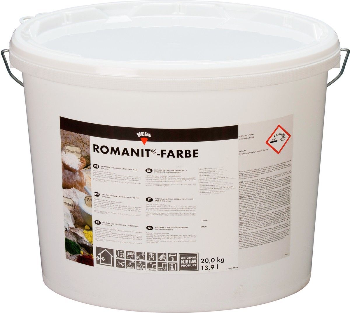 KEIM Romanit®-Farbe 20 kg Details für Romanit®-Farbe 20 kg: Anwendungsfertige Kalkfarbe für den Außen- und Innenbereich auf Basis von Sumpfkalk. Gutes Deckvermögen durch Anreicherung mit Titandioxid. Besonders geeignet für den alternativen Wohnbau, insbesondere auf Kalkputzen, Kalkzementputz