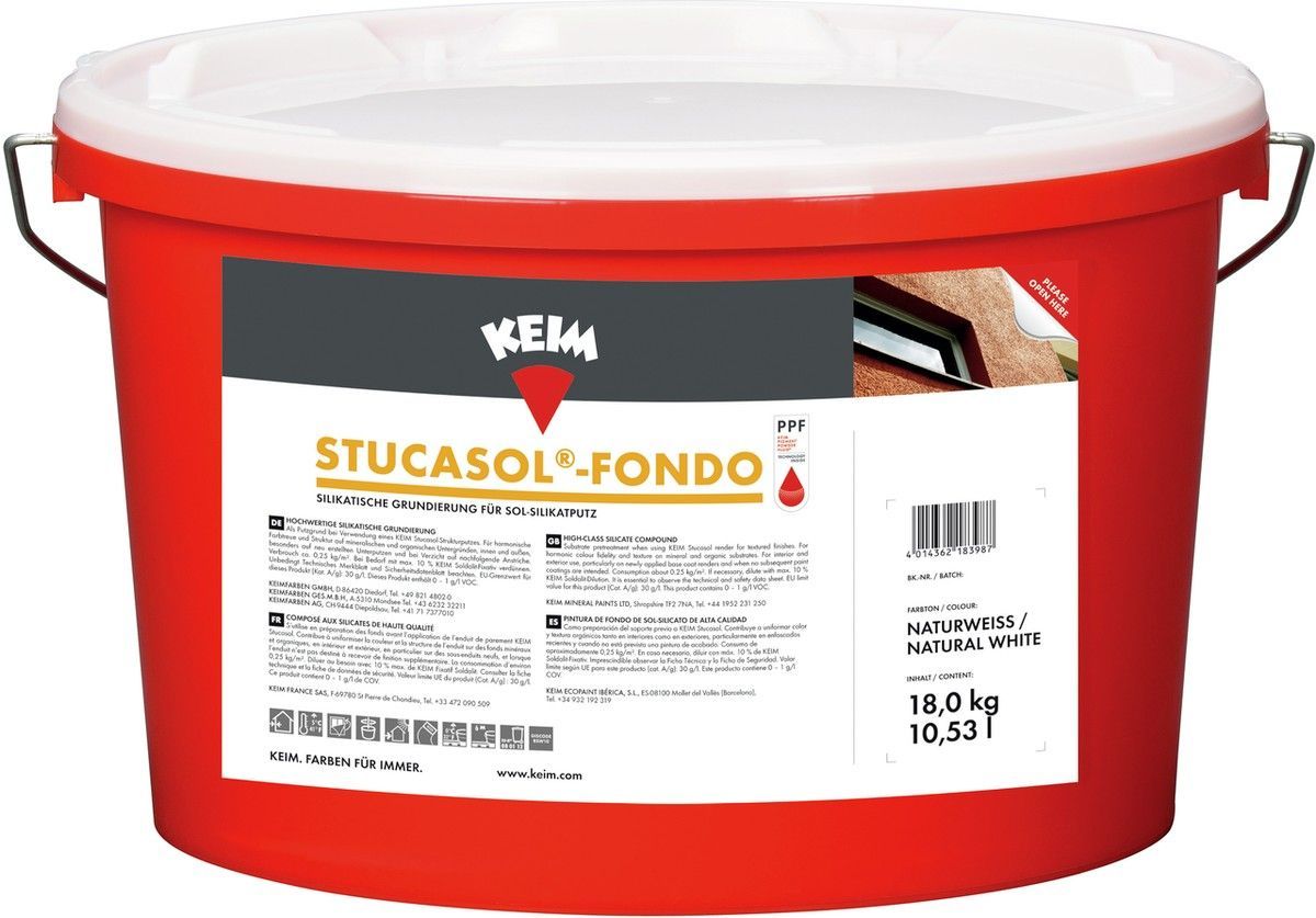 KEIM Stucasol®-Fondo 18 kg Details für Stucasol®-Fondo 18 kg: Silikatische Grundierung für den nachfolgenden Putzauftrag mit KEIM Stucasol. Anwendung für harmonische Farbtreue und Struktur auf mineralischen und organischen Untergründen, innen und außen, besonders auf neu erstellten Unterputz