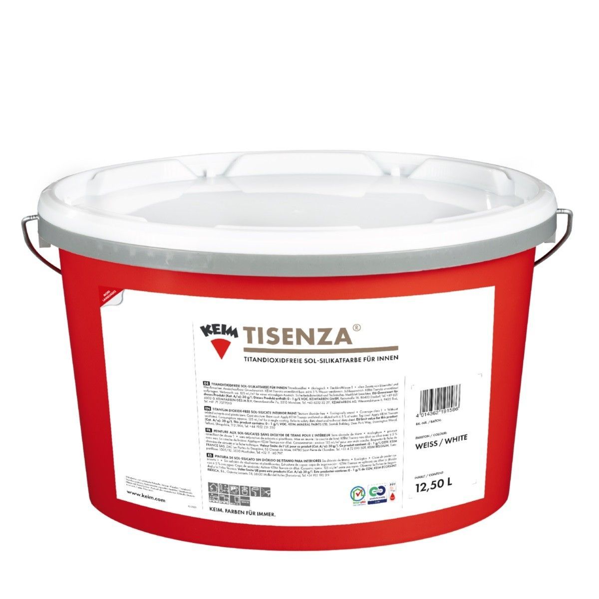 KEIM Tisenza® 2,5 Liter Details für Tisenza® 2,5 Liter: KEIM Tisenza ist eine titandioxidfreie, anwendungsfertige Sol-Silikatfarbe für innen nach DIN 18363 Abs. 2.4.1 Dispersionssilikatfarbe. Durch den Verzicht auf das Weißpigment Titandioxid werden warme, pastellfarbige Farbtöne mit einer e