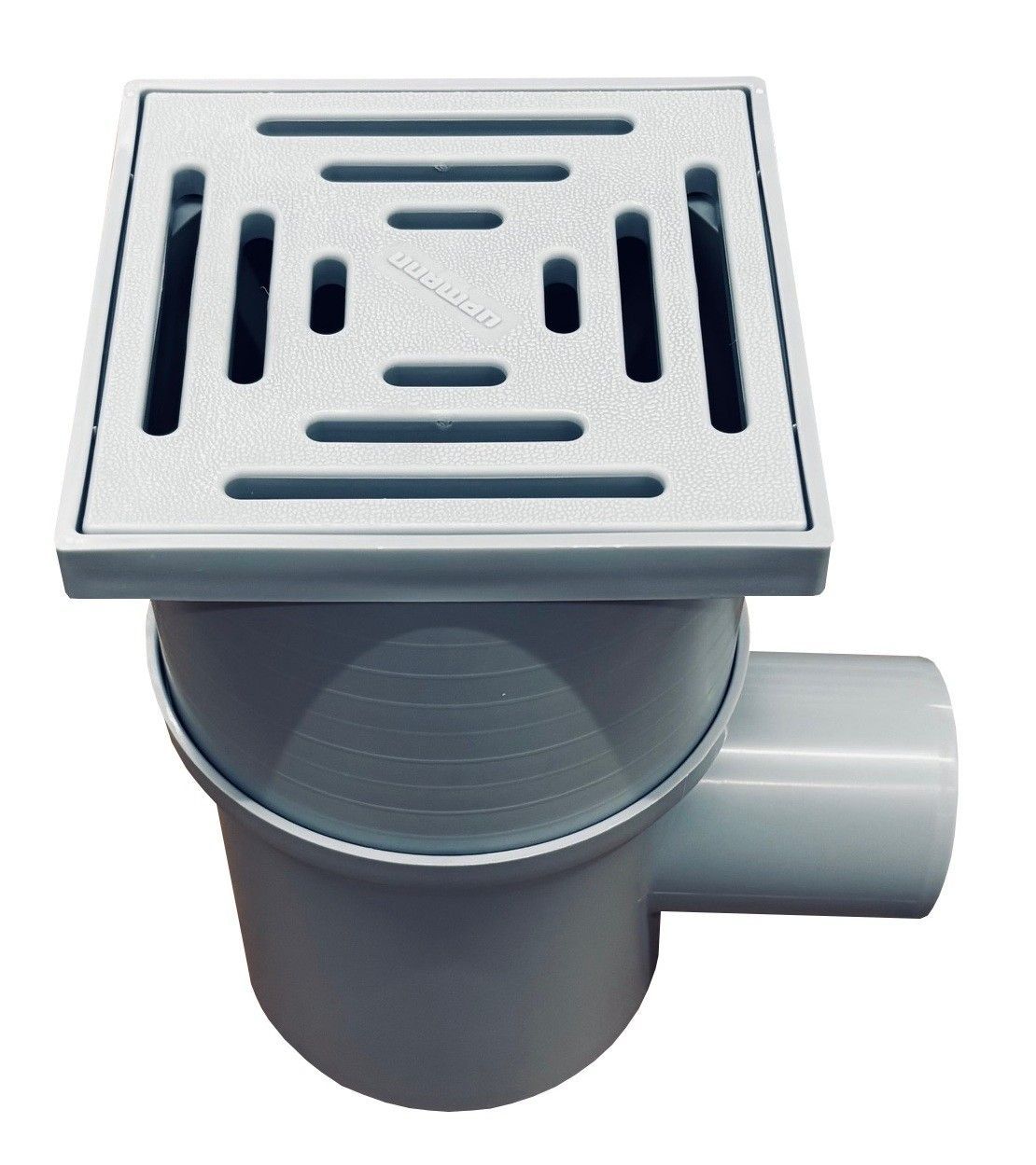 Upmann Kellerablauf 15 x 15 cm mit Aufsatzrahmen Abgang waagerecht DN 75, Kunststoffrost