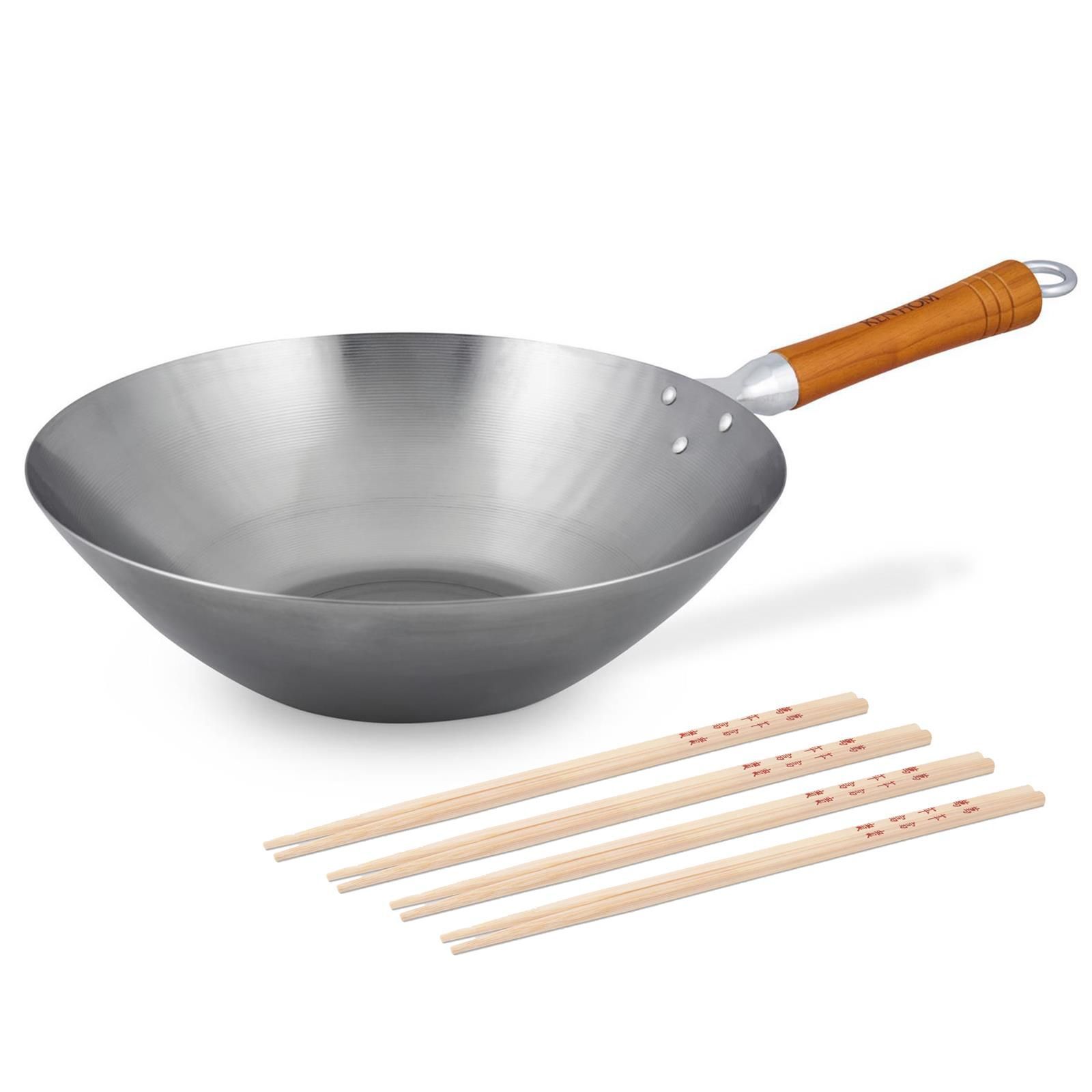 Ken Hom Wok 31 cm Induktion Karbonstahl Wokpfanne unbeschichtet 8er Stäbchen Set