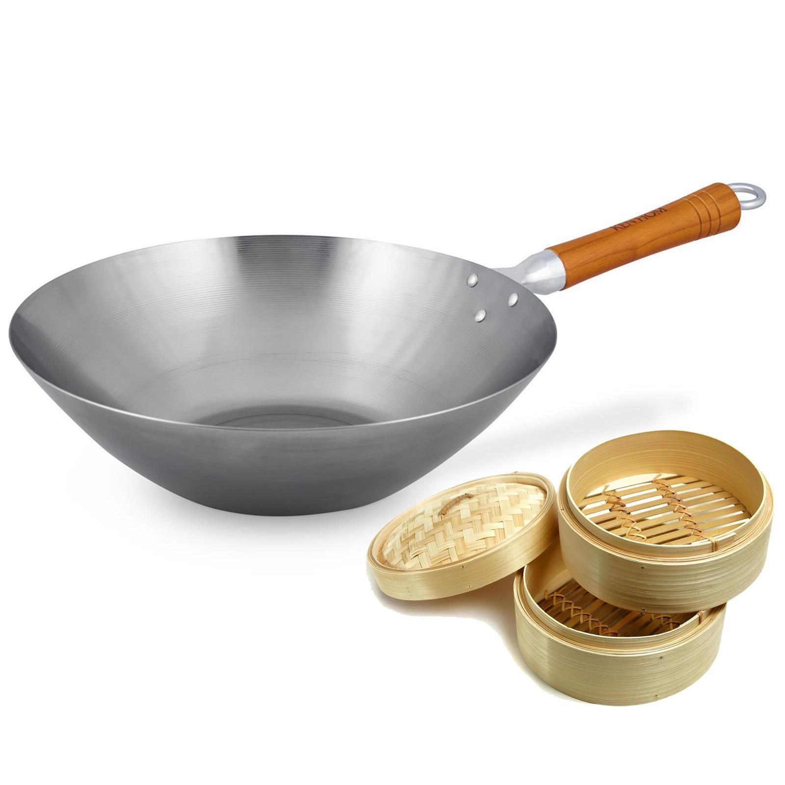 Ken Hom Wok 31cm Induktion unbeschichtet Karbonstahl Holzgriff & Dampfkorb 20 cm