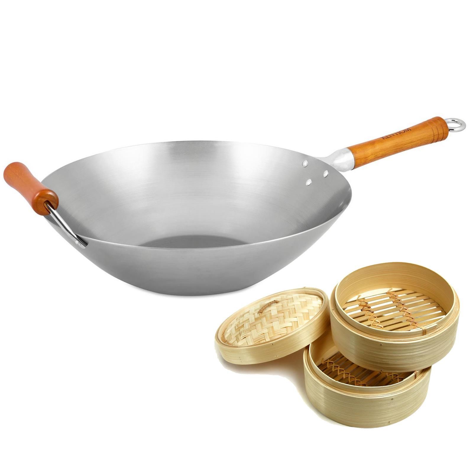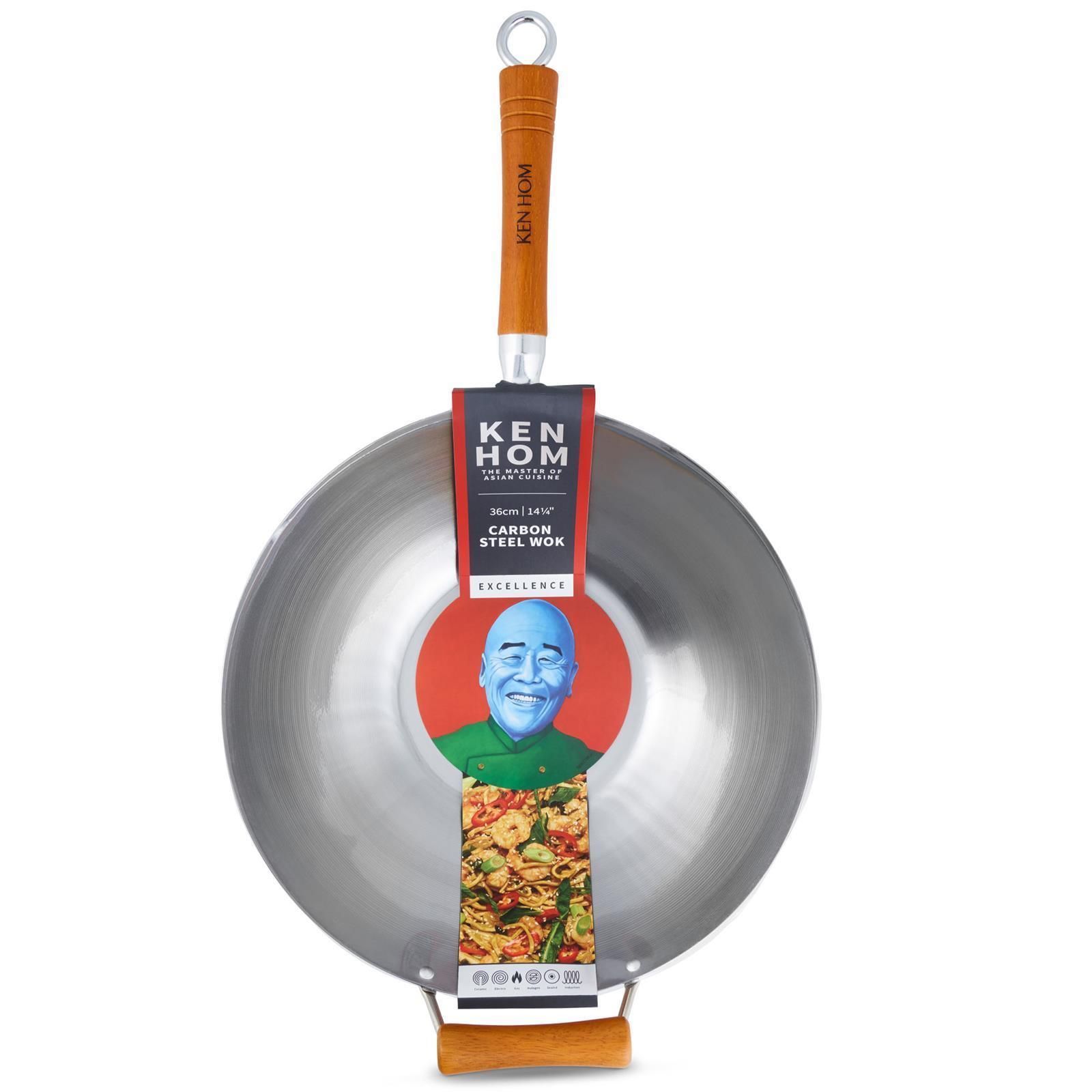 Ken Hom Wok 36 cm Induktion Wokpfanne & Dampfkorb Ø 20 cm Karbonstahl Holz-Griff