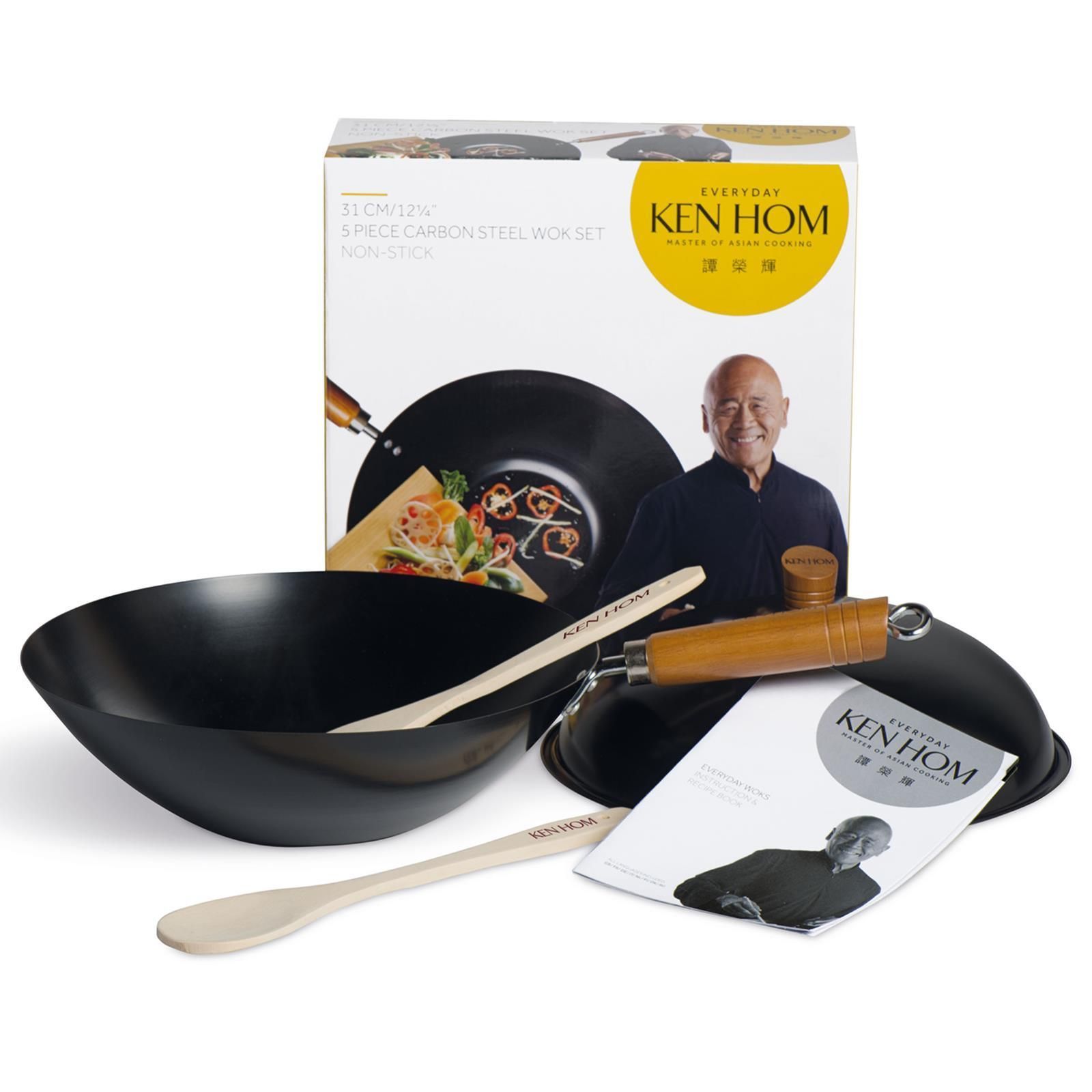 Ken Hom Wok mit Deckel 31 cm 5-tlg. Karbonstahl Antihaft inkl. Wender & Löffel