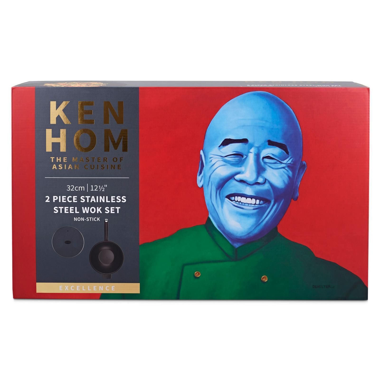 Ken Hom Wok Set 32cm & Deckel Induktion Edelstahl-Antihaft & Kelle & Hackmesser