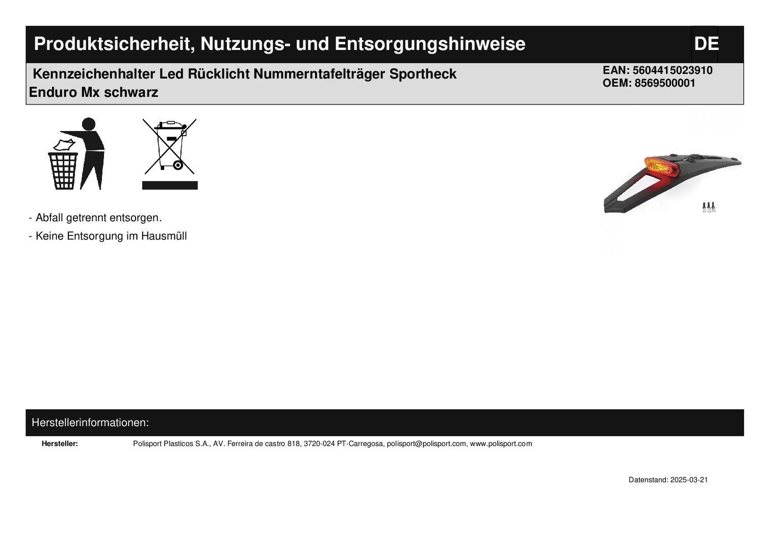Polisport Kennzeichenhalter Led Rücklicht Nummerntafelträger Sportheck Enduro Mx schwarz