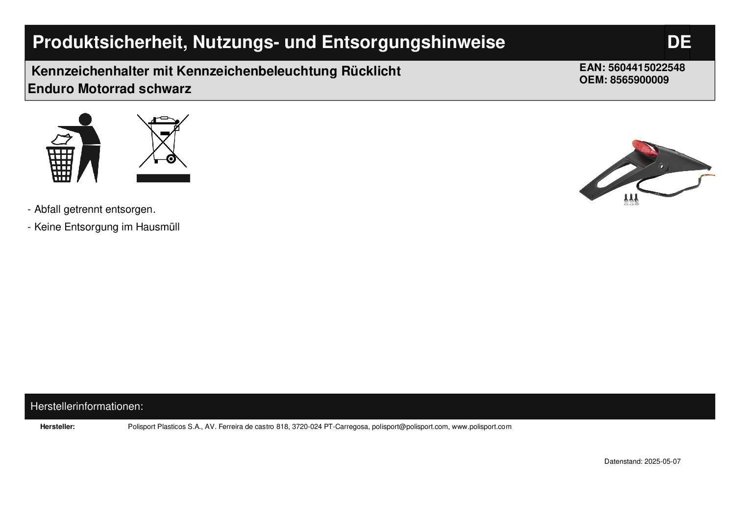 Polisport Kennzeichenhalter mit Kennzeichenbeleuchtung Rücklicht Enduro Motorrad schwarz