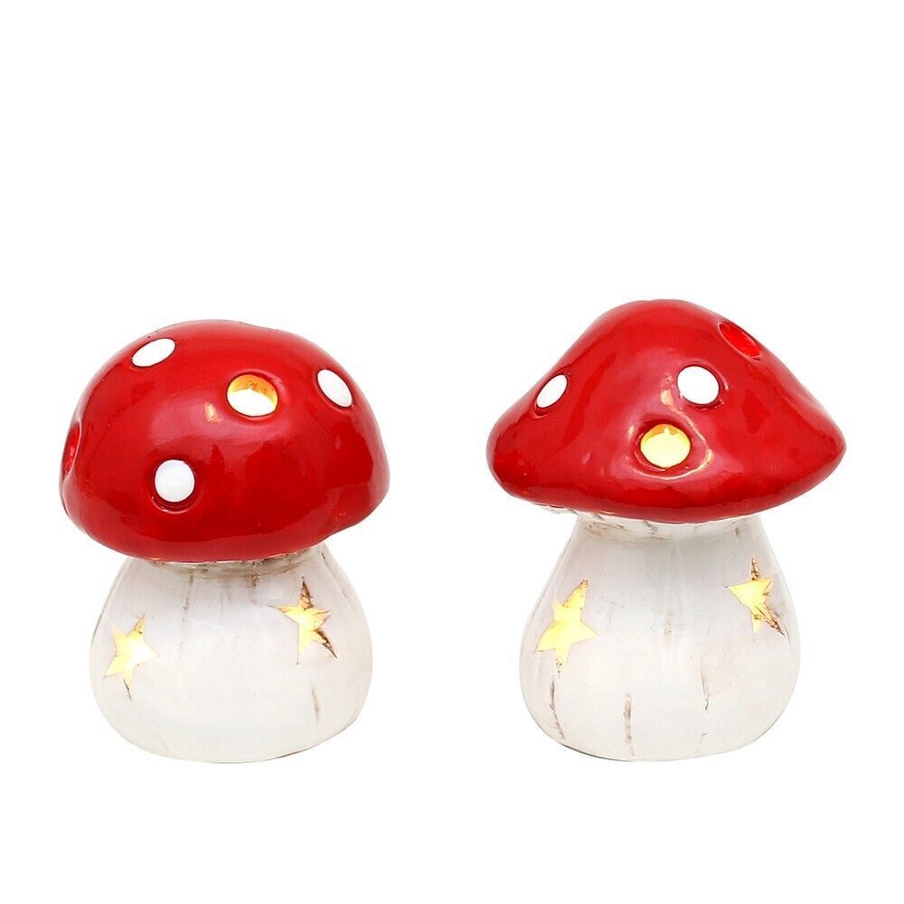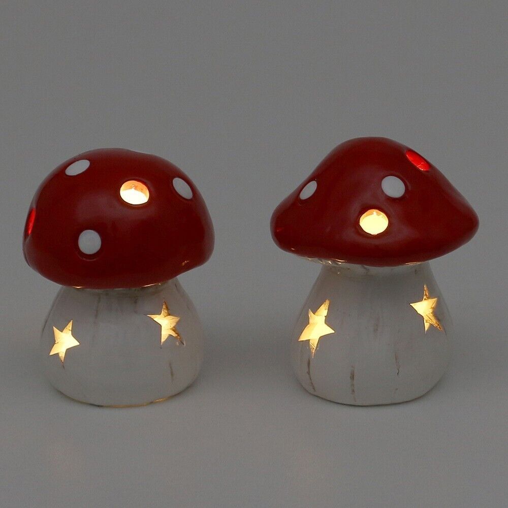 Keramik 2er Set Pilze | Paar "Fliegenpilz" mit LED-Beleuchtung Dekoration