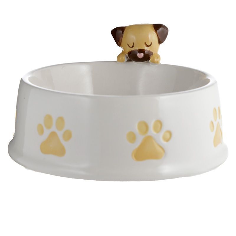Keramik Brauner Mopshund auf Rand Fressnapf
