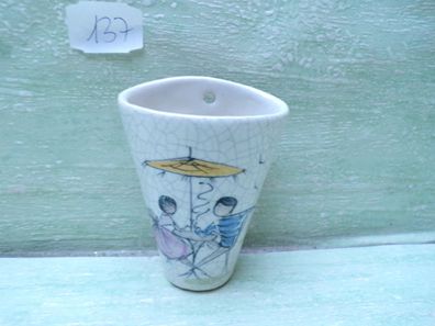 Keramik Wandvase Craqule Optik Cafe-Szene ca 8,5cm handgemalt Handarbeit RAR