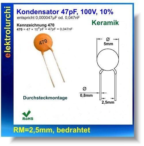 Keramikkondensator Kerko47pF, 100Volt, 10%, RM2.5mm, 20St.
