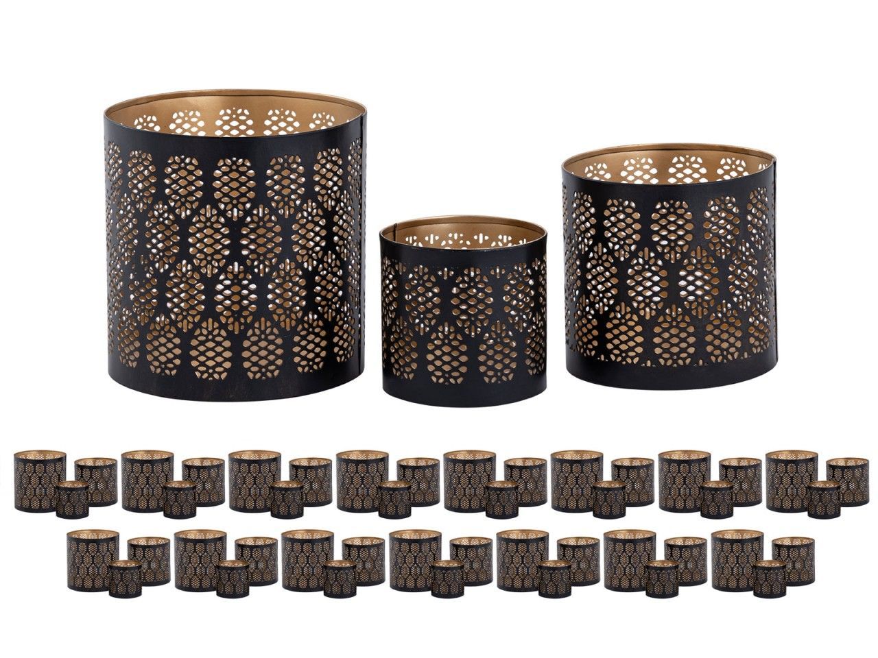 Schönes Kerzenständer Set Orient 3-teilig aus edlem Metall in schwarz-goldener Optik Ø 8/10 u.14cm - Höhen 8/10 u. 14cm. ., Vielseitig einsetzbar: Das hochwertig verarbeitete Kerzenständer Set 3-teilig aus filigranem Metallblech ist perfekt für jeden Anlass und jede Raumgestaltung geeignet., Eleganter Style: Das schwarz-goldene Design verleiht jedem Raum eine stilvolle Atmosphäre und romatische Highlights, Umfangreiches Set in der Masterbox 18x 3er Set in der Einzelverpackung: Das ...