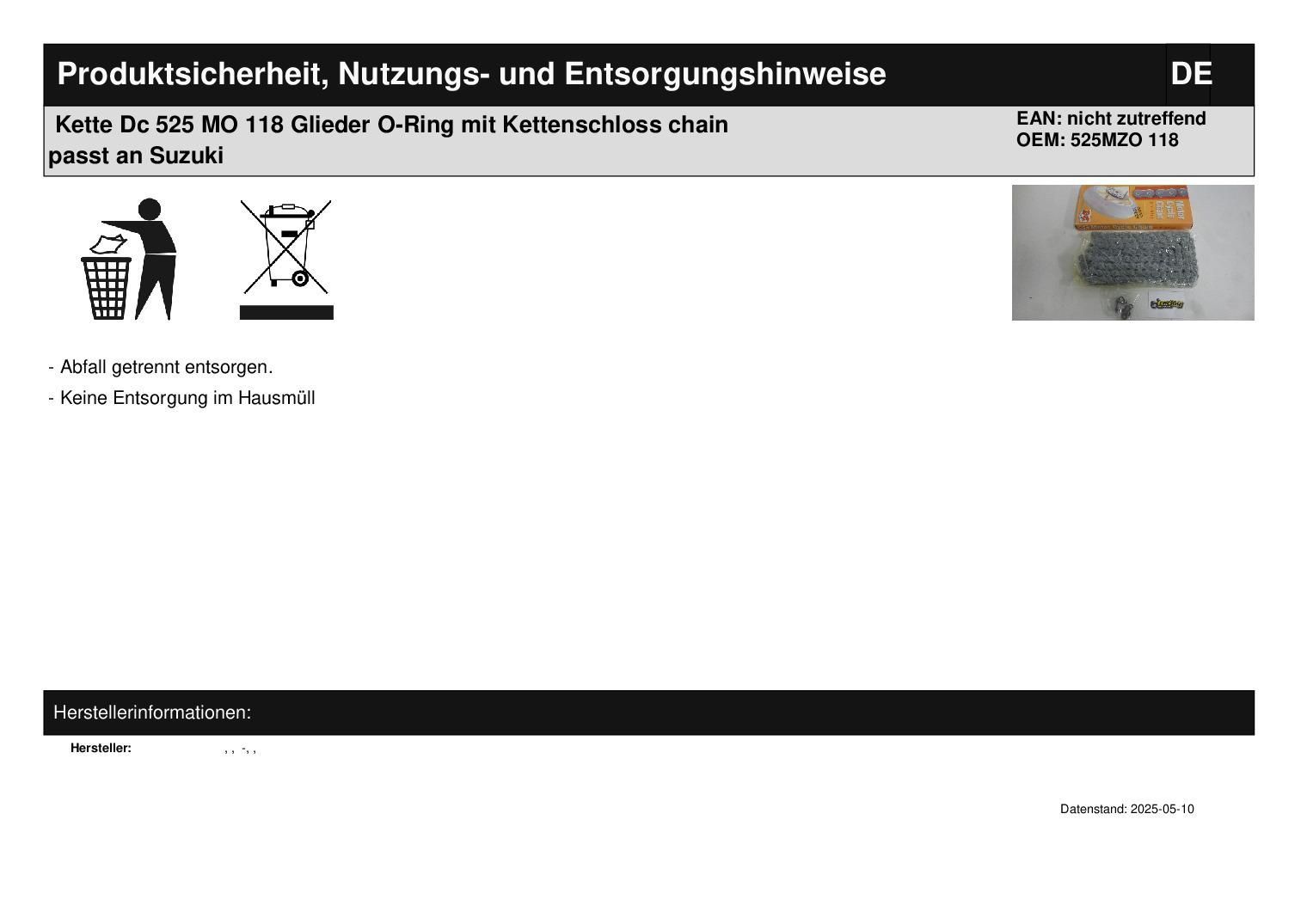 Kette Dc 525 MO 118 Glieder O-Ring mit Kettenschloss chain passt an Suzuki