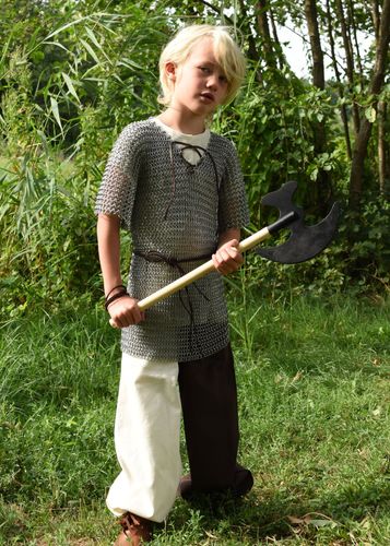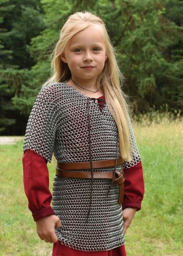 Kettenhemd für Kinder, verzinkter Stahl Dieses kurzärmelige Kettenhemd für Kinder hat einen geschlitzten Rundhalsausschnitt. Der Schlitz erleichtert das Überziehen enorm und wird mit einem hellen Lederband (Lederfarbe wie auf dem letzten Bild) geschlossen. Das Lederband ist im Lieferumfang enthalten