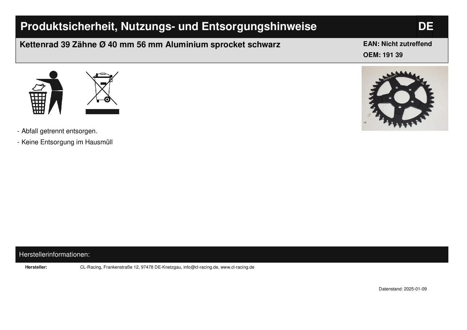 Kettenrad 39 Zähne Ø 40 mm 56 mm Aluminium sprocket schwarz