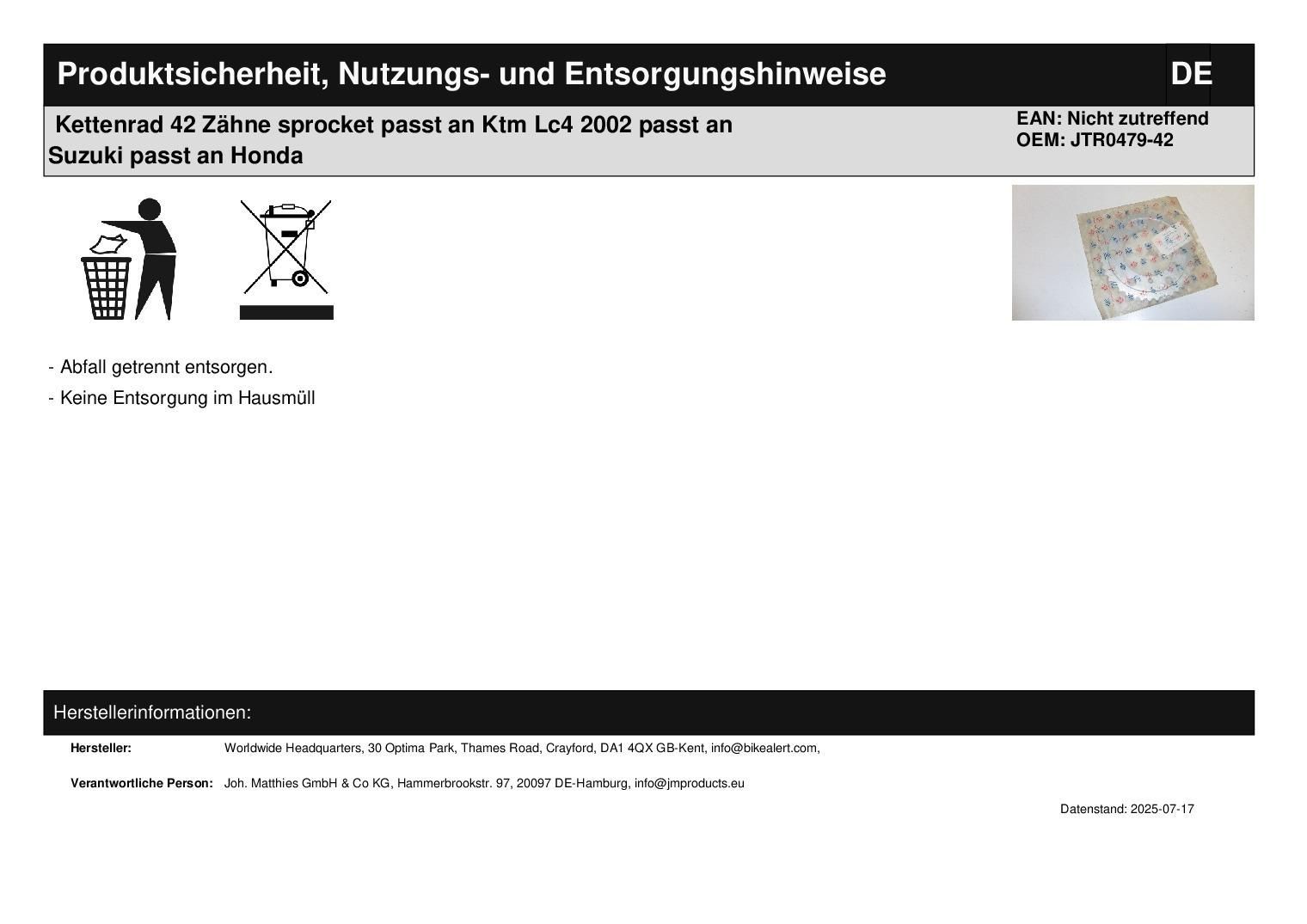 Kettenrad 42 Zähne sprocket passt an Ktm Lc4 2002 passt an Suzuki passt an Honda