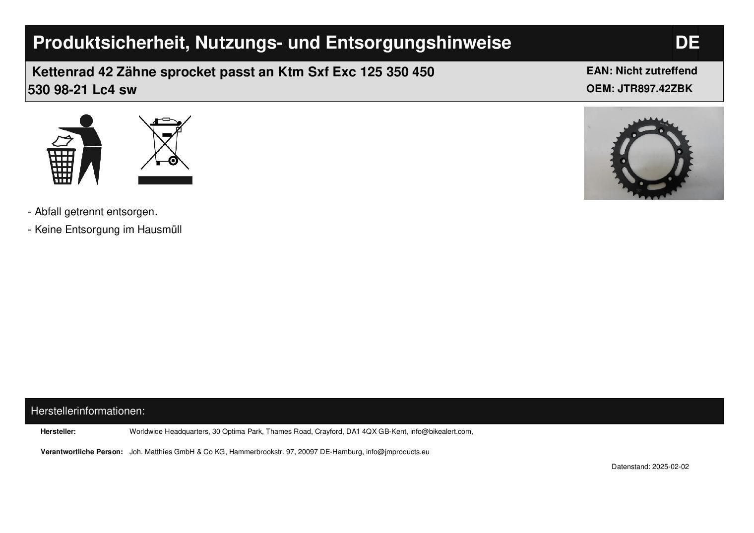 Kettenrad 42 Zähne sprocket passt an Ktm Sxf Exc 125 350 450 530 98-21 Lc4 sw