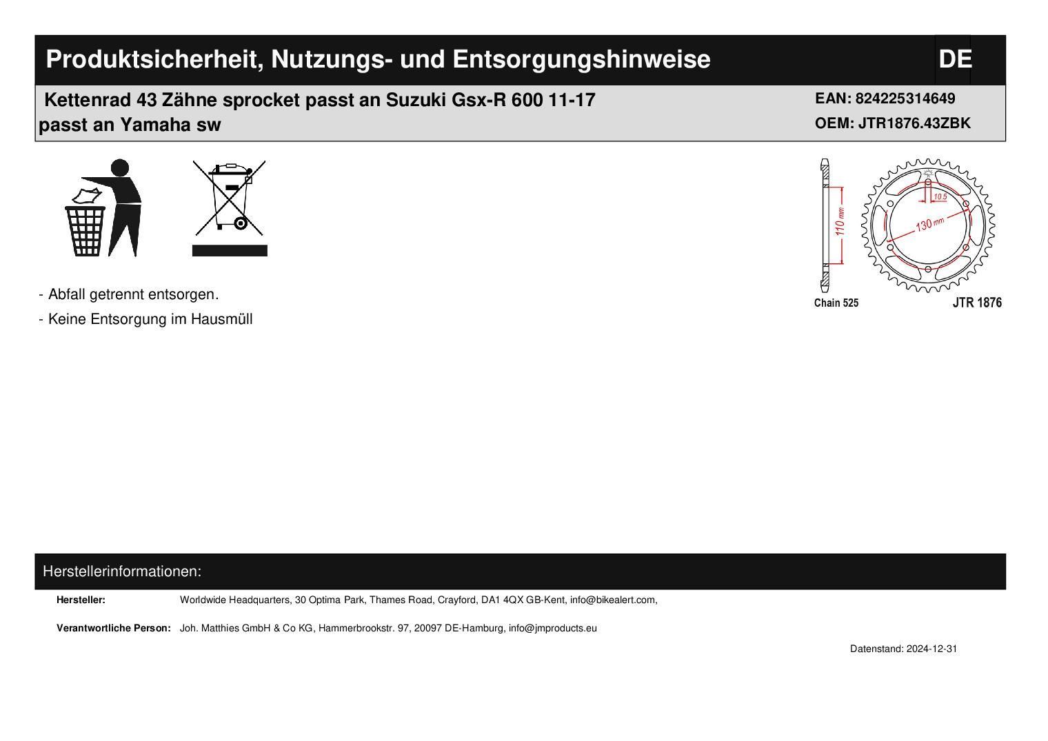 Kettenrad 43 Zähne sprocket passt an Suzuki Gsx-R 600 11-17 passt an Yamaha sw