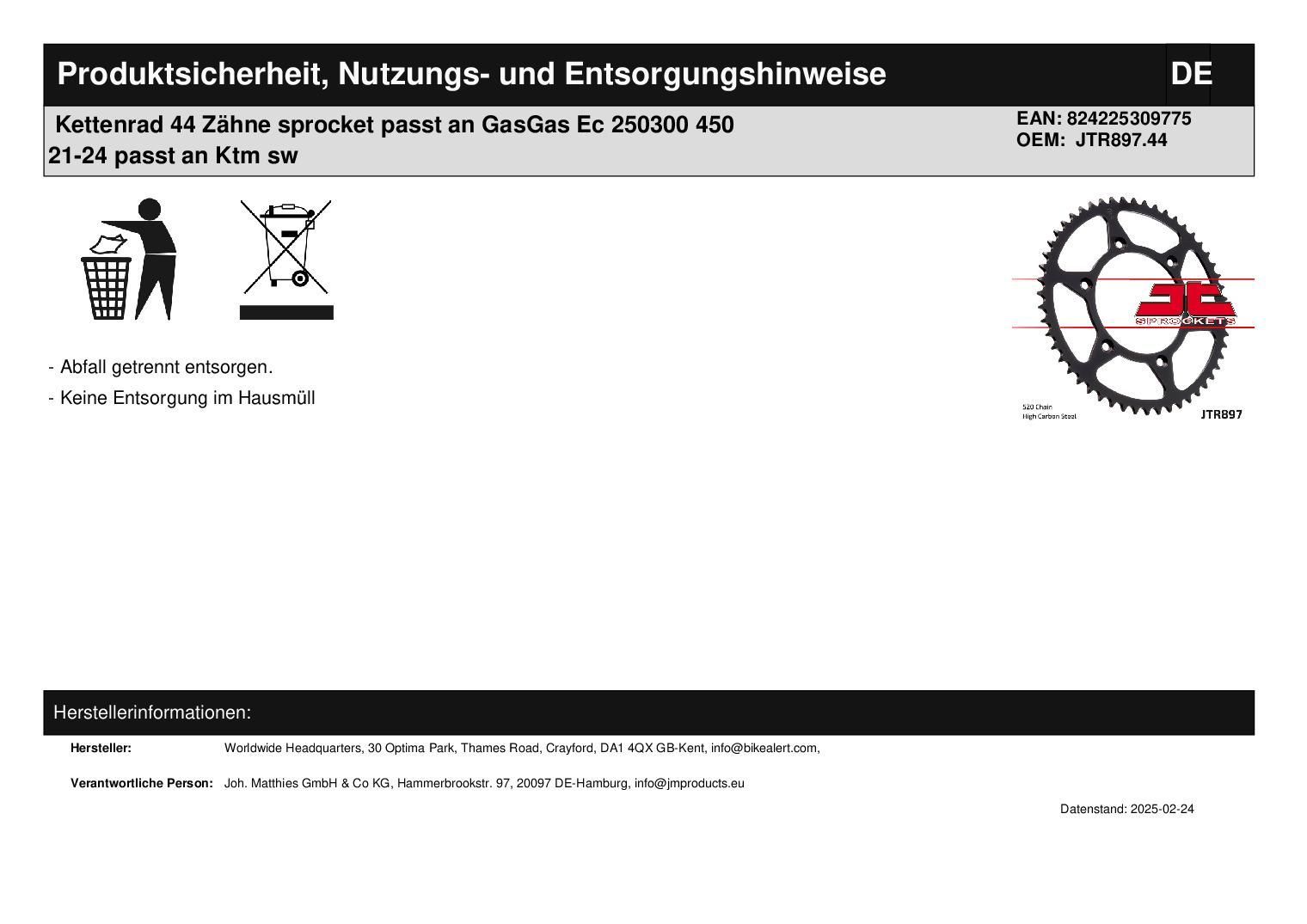 Kettenrad 44 Zähne sprocket passt an GasGas Ec 250300 450 21-24 passt an Ktm sw