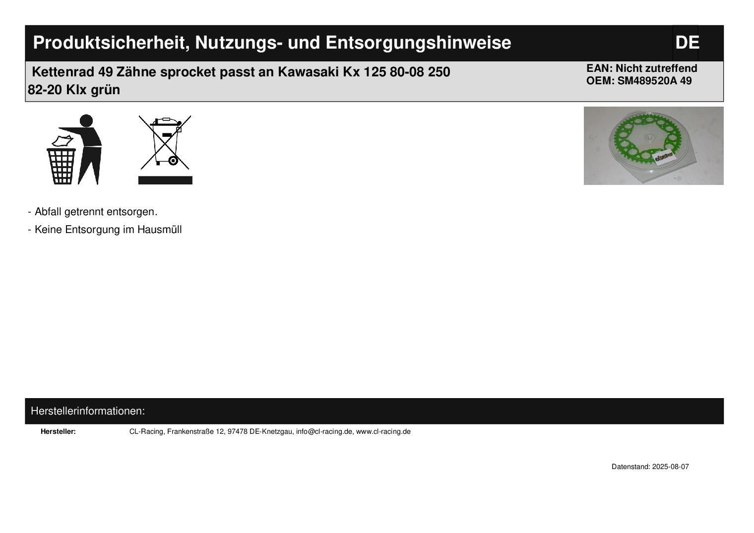 Kettenrad 49 Zähne sprocket passt an Kawasaki Kx 125 80-08 250 82-20 Klx grün