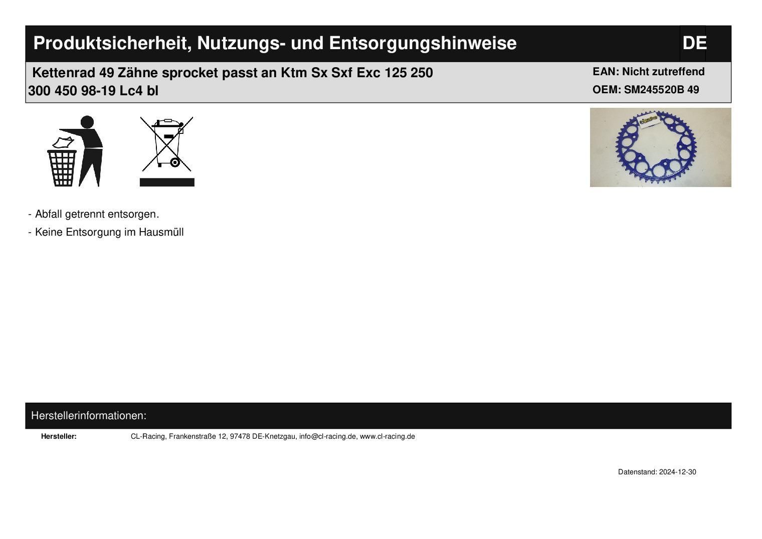 Kettenrad 49 Zähne sprocket passt an Ktm Sx Sxf Exc 125 250 300 450 98-19 Lc4 bl