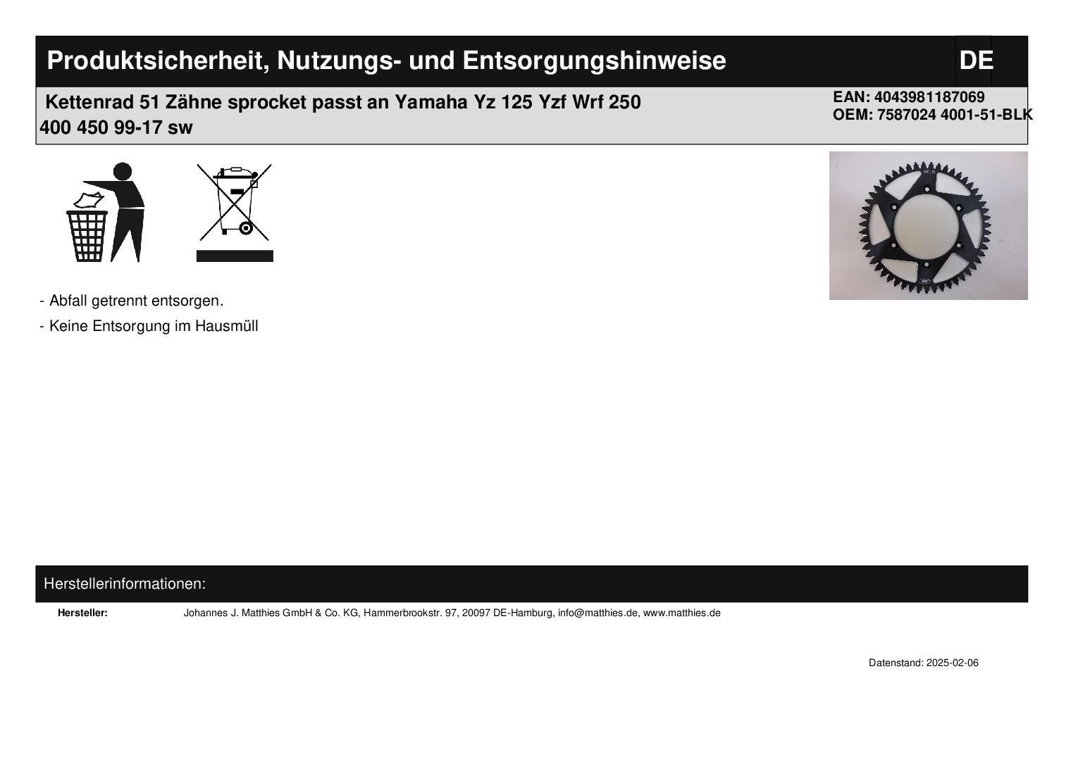 JMP Kettenrad 51 Zähne sprocket passt an Yamaha Yz 125 Yzf Wrf 250 400 450 99-17 sw