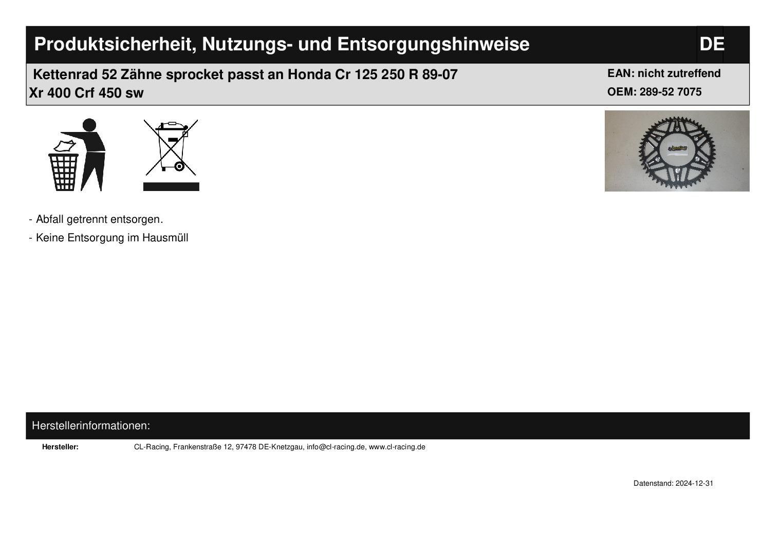 Kettenrad 52 Zähne sprocket passt an Honda Cr 125 250 R 89-07 Xr 400 Crf 450 sw