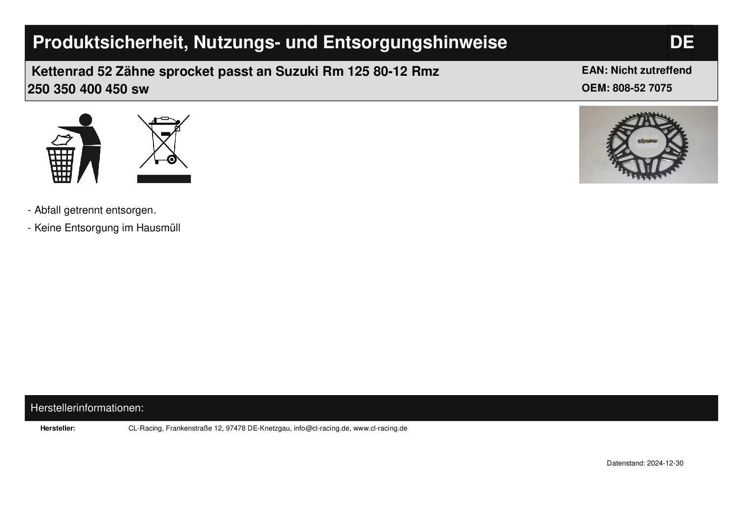 Kettenrad 52 Zähne sprocket passt an Suzuki Rm 125 80-12 Rmz 250 350 400 450 sw