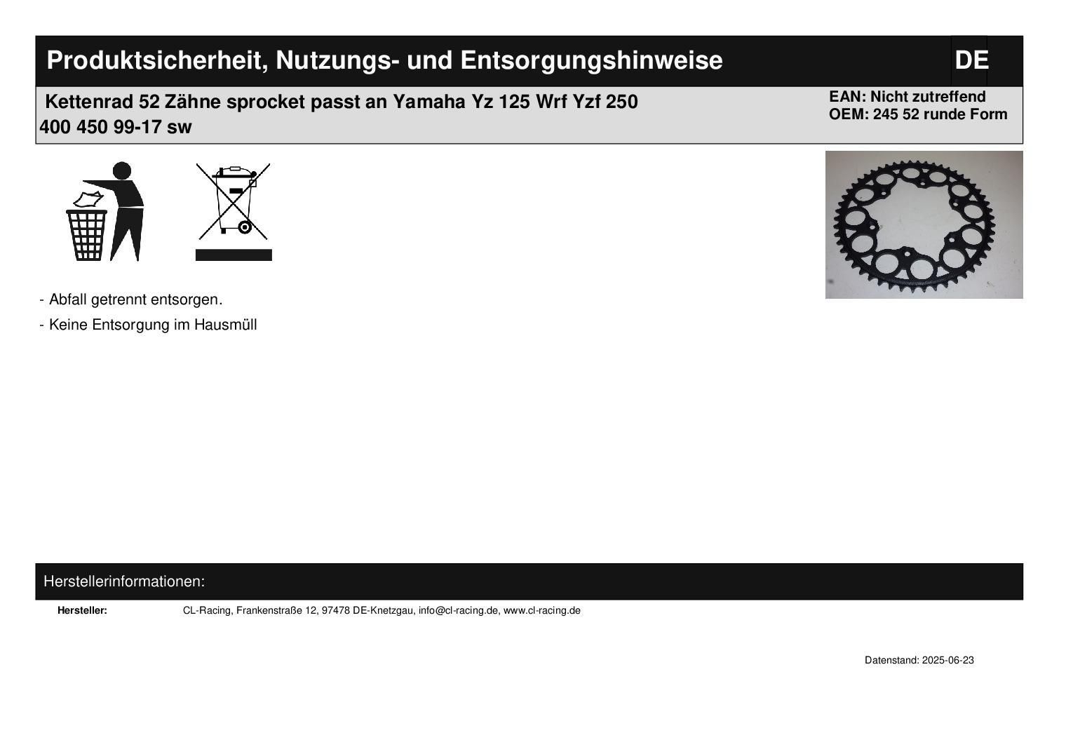 Kettenrad 52 Zähne sprocket passt an Yamaha Yz 125 Wrf Yzf 250 400 450 99-17 sw