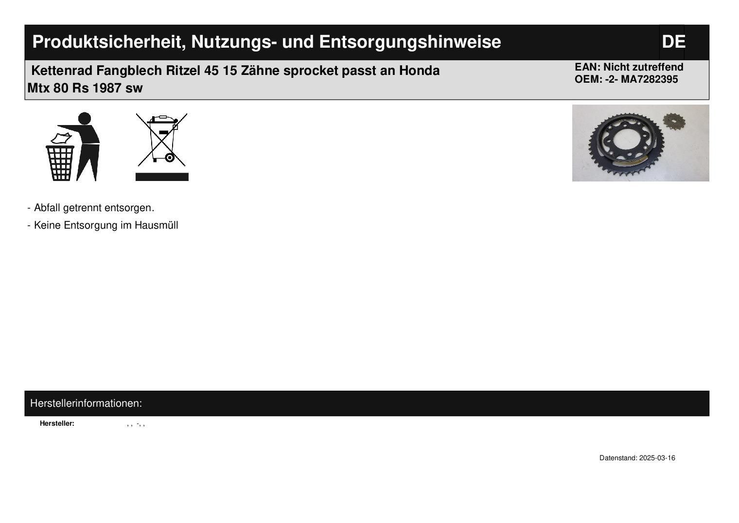 Kettenrad Fangblech Ritzel 45 15 Zähne sprocket passt an Honda Mtx 80 Rs 1987 sw