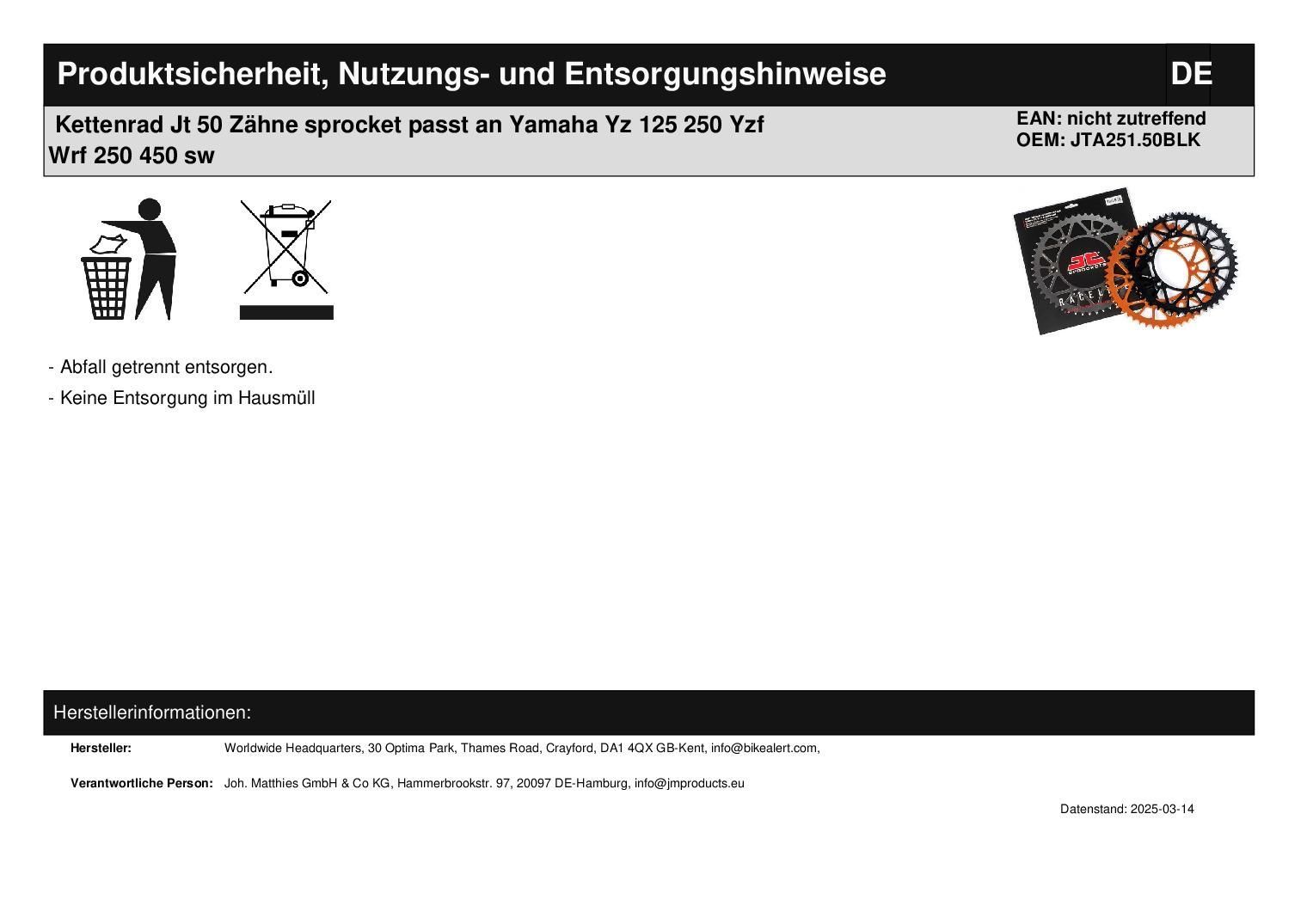 Kettenrad Jt 50 Zähne sprocket passt an Yamaha Yz 125 250 Yzf Wrf 250 450 sw