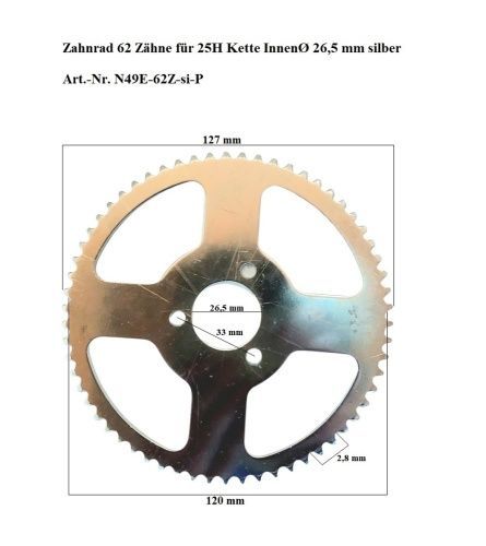 Kettenrad Ritzel Zahnrad Antriebsrad Kette 62 Zähne 25H Kette InnenØ 26,5 mm silber