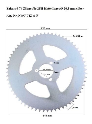 Kettenrad Ritzel Zahnrad Antriebsrad Kette 74 Zähne 25H Kette InnenØ 26,5 mm silber