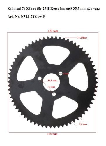 Kettenrad Ritzel Zahnrad Antriebsrad Kette 74 Zähne 25H Kette InnenØ 35,5 mm schwarz
