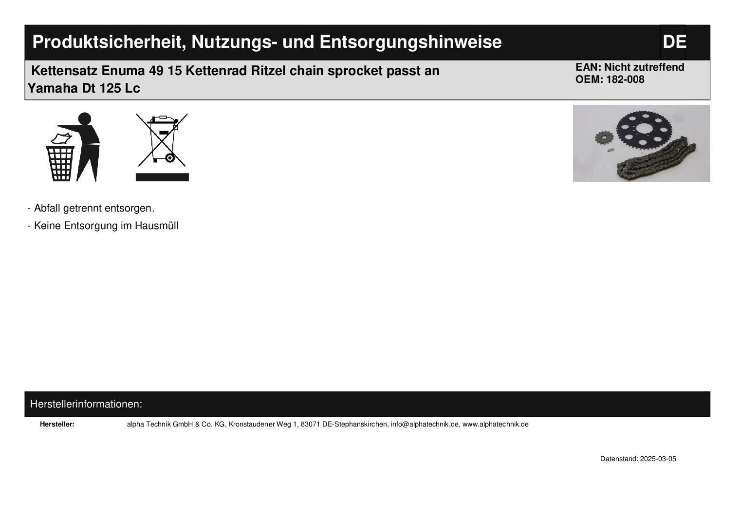 Kettensatz Enuma 49 15 Kettenrad Ritzel chain sprocket passt an Yamaha Dt 125 Lc