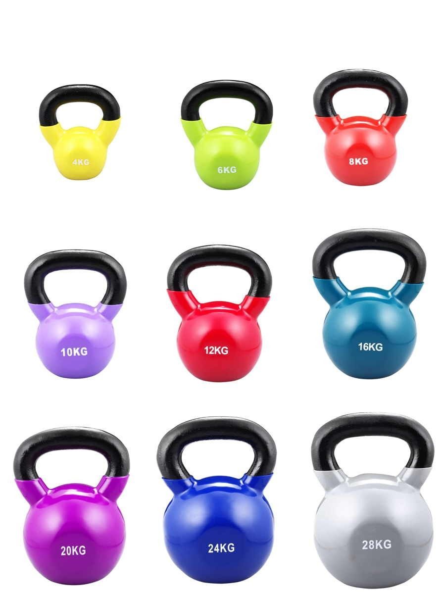 Material: Gusseisen mit Vinyl Kennzeichnung: je Gewicht eine andere Farbe Gewichte: 4 kg, 6 kg, 8 kg, 10 kg, 12 kg, 16 kg, 20 kg, 24 kg, 28 kg