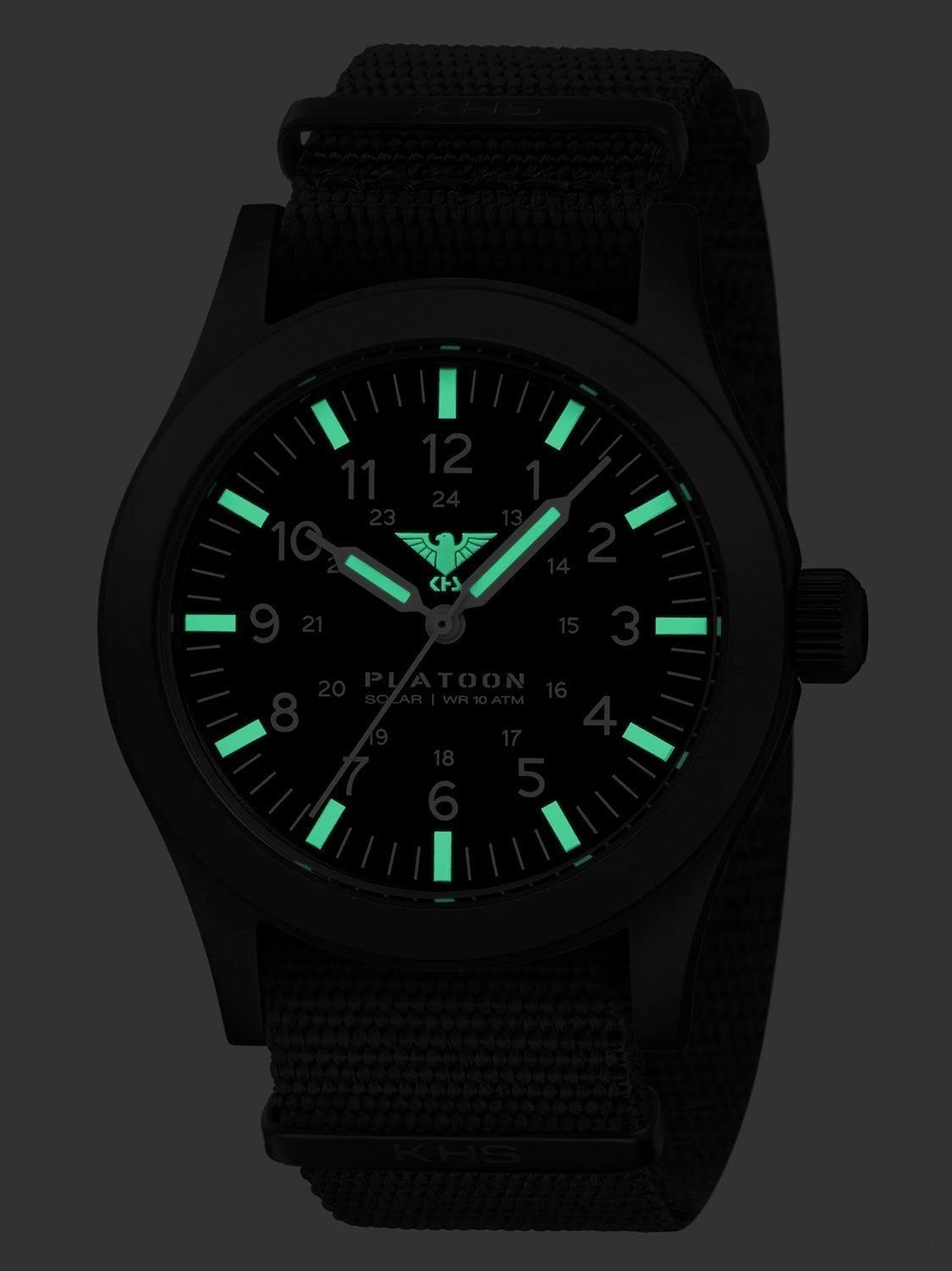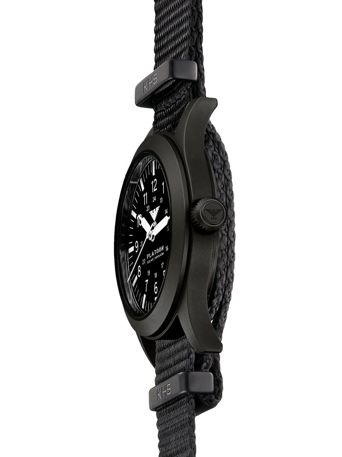 Einsatzuhr mit einem präzisen Solar-Quarzwerk, Gangreserve bis zu 4 Monate, mattschwarzes Zifferblatt, Leuchtzeiger und -markierungen, weiße Zahlen, zentraler Sekundenzeiger, Gehäuse aus mattem Edelstahl, schwarz ionen-plattiert, verschraubter Gehäuseboden, extra gehärtetes Mineralglas, Nato-Armband aus schwarzem Nylon mit 3 Metallschlaufen, Dornschließe mit Logogravur, wasserdicht bis 10 bar, Breite (ohne Krone) 42 mm, Gehäusehöhe 10,4 mm