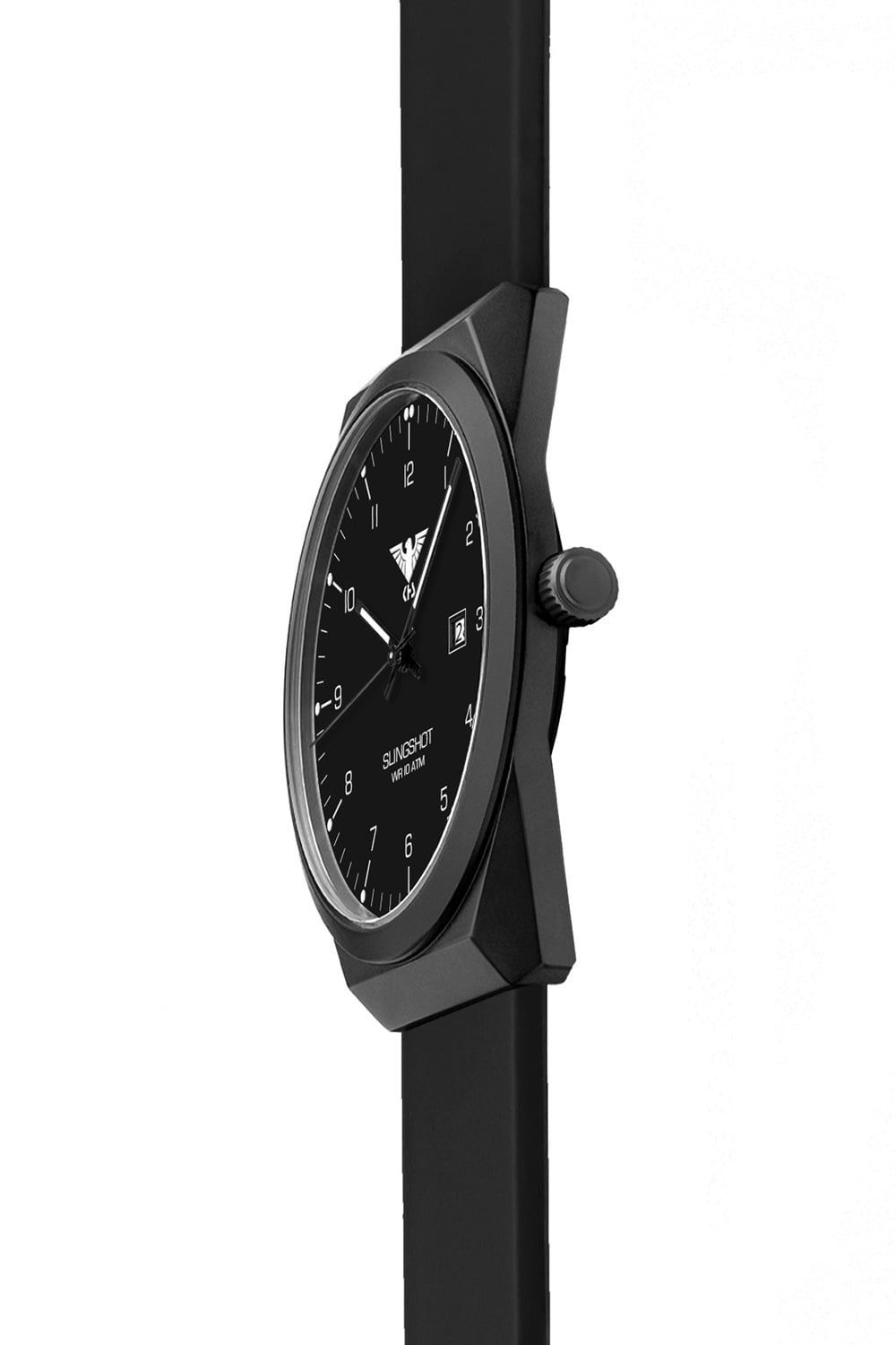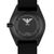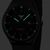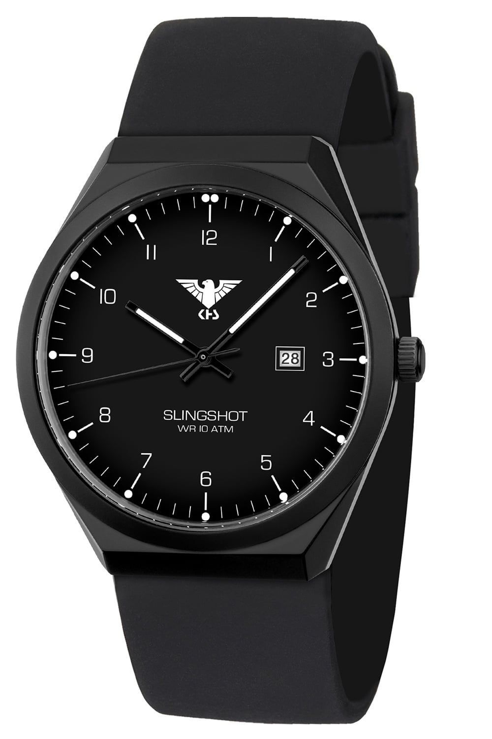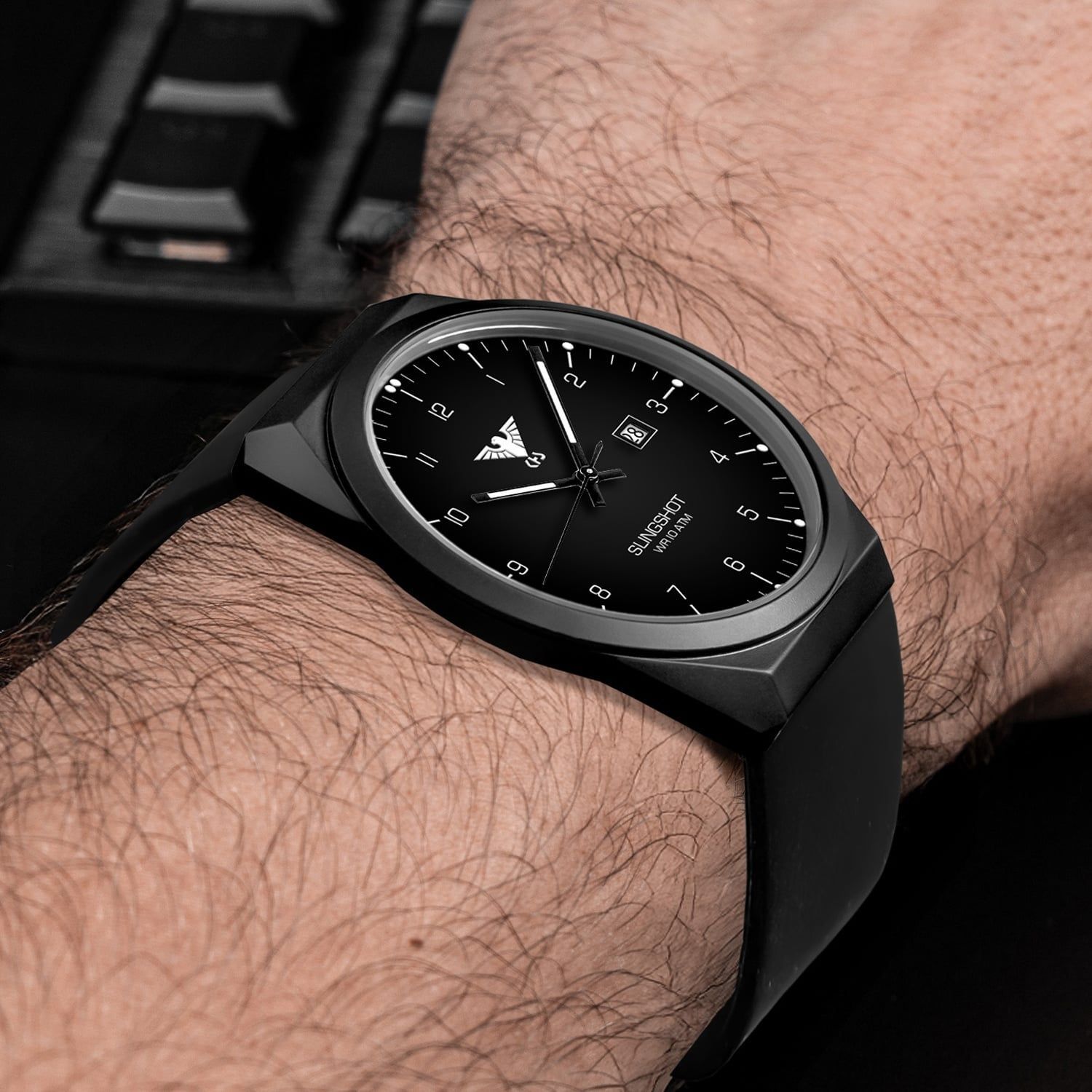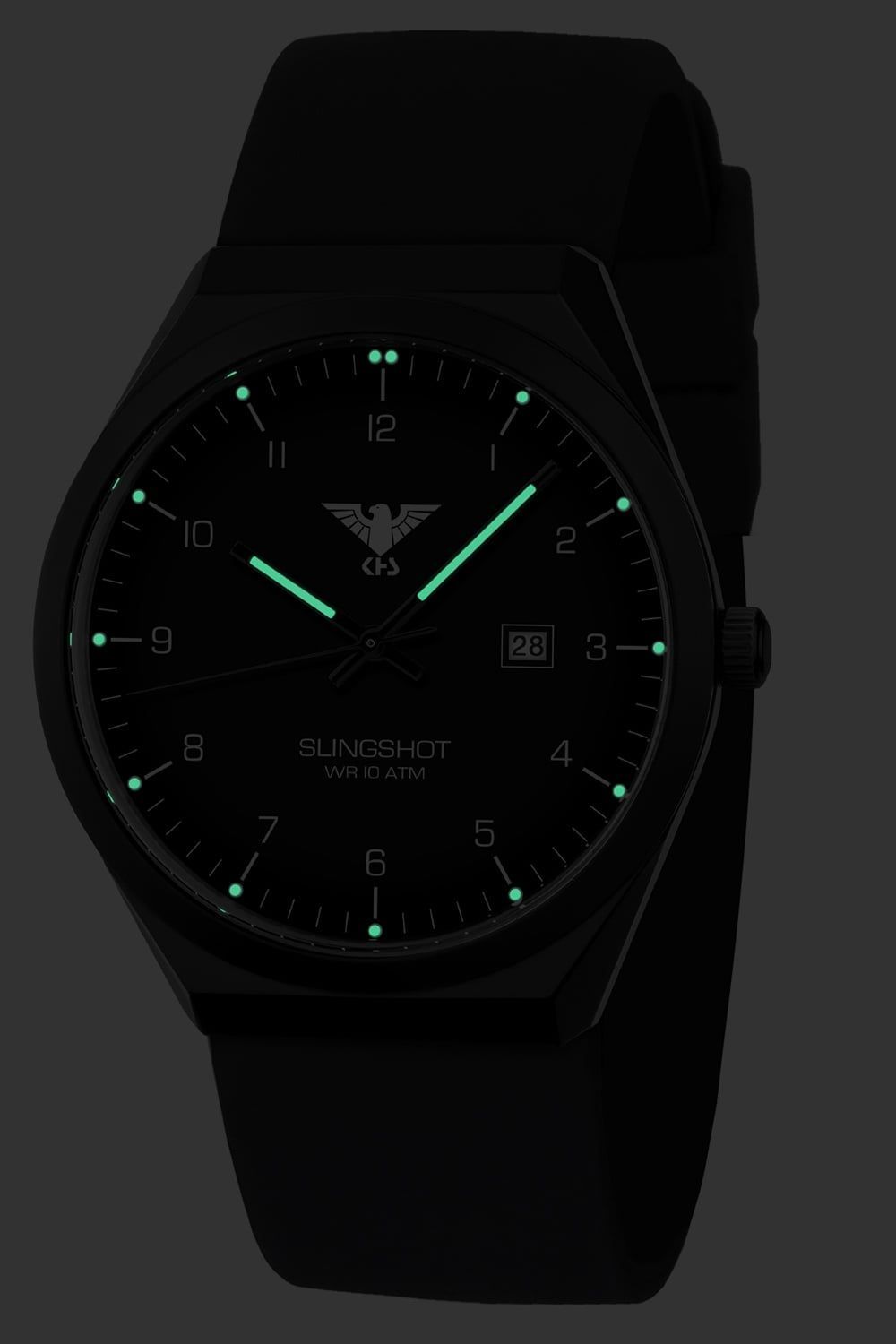 attraktive Armbanduhr für Männer, mit einem präzisen Quarzwerk, Datumsanzeige, schwarzes Zifferblatt, Zeiger und Stundenpunkte mit grüner C1-Leuchtfarbe von lang anhaltender Leuchtkraft, feine weiße Zahlen und Indizes, zentraler Sekundenzeiger, Gehäuse aus mattem Edelstahl, schwarz PVD-beschichtet, verschraubter Gehäuseboden, geriffelte Krone, extra gehärtetes Mineralglas, Armband aus schwarzem Silikon, Dornschließe mit Logogravur, wasserdicht bis 10 bar, Breite (ohne Krone) 42 mm, Gehäusehöhe 8
